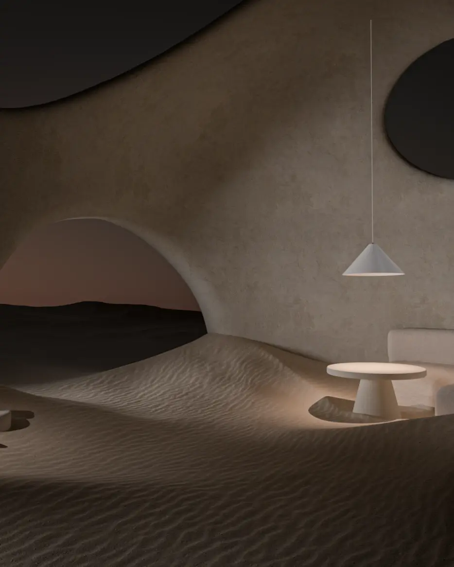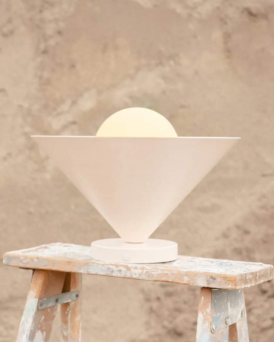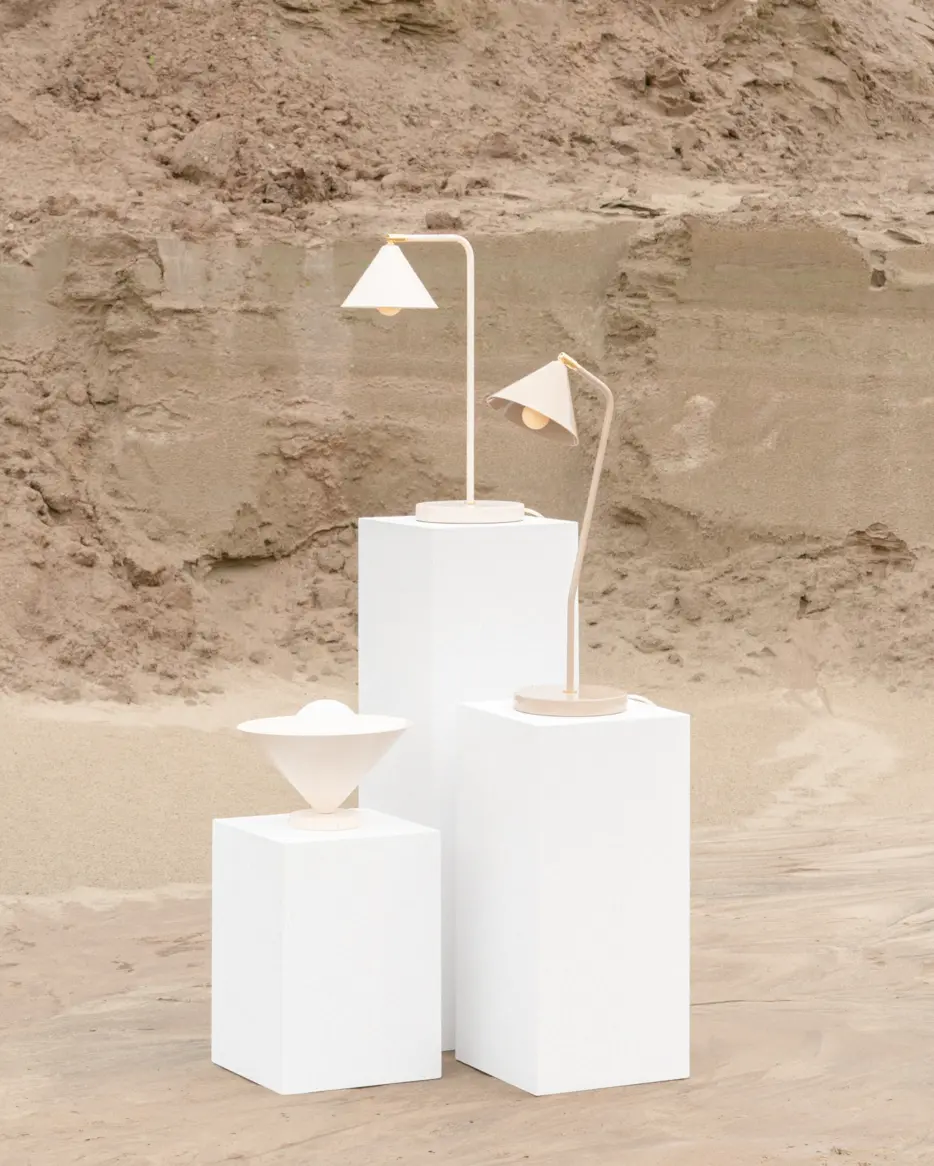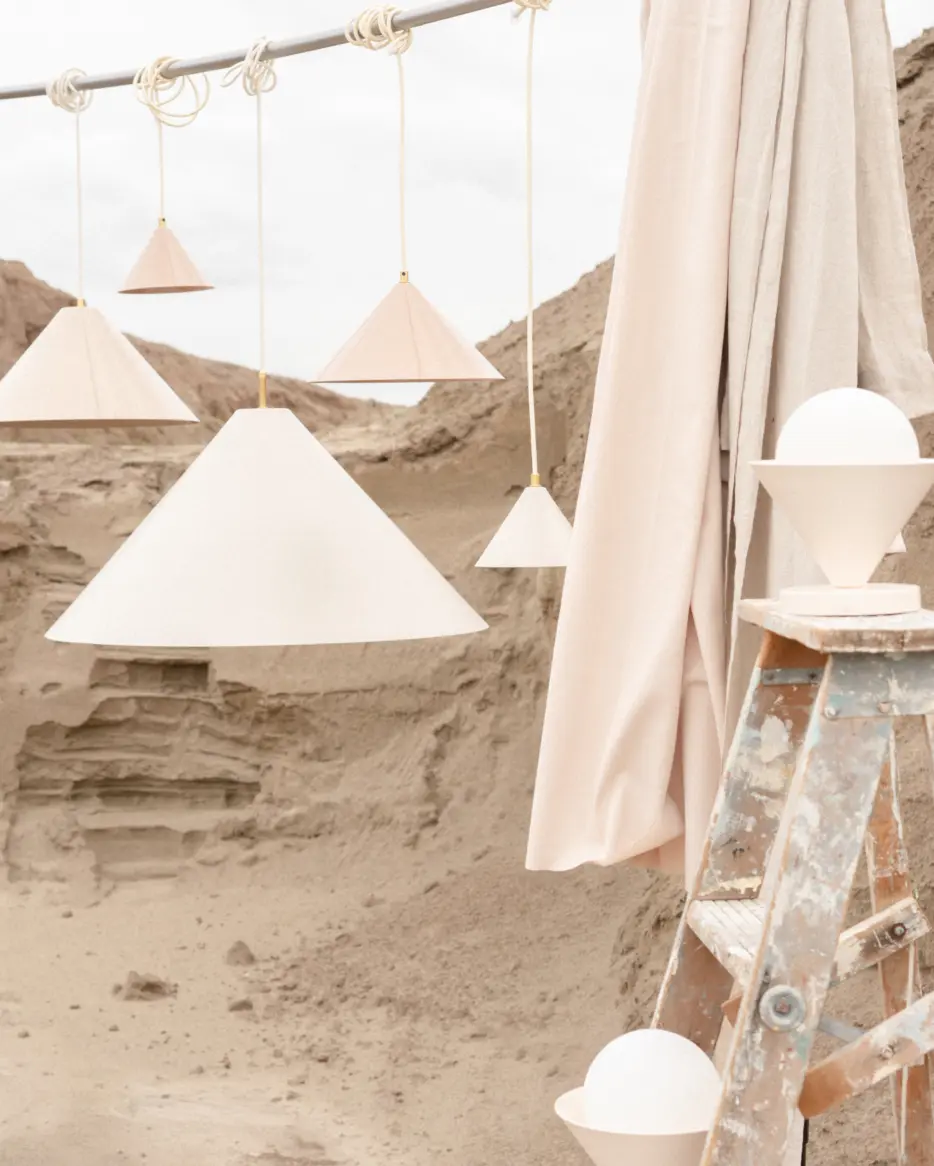 Greatly inspired by the beauty that emanates from sand dunes, we had the desire to bring the conical shape forward. It is presented here with our palette of soft colors, inspired by the desert environment which preserves the luminosity and recalls the textures of the sand.