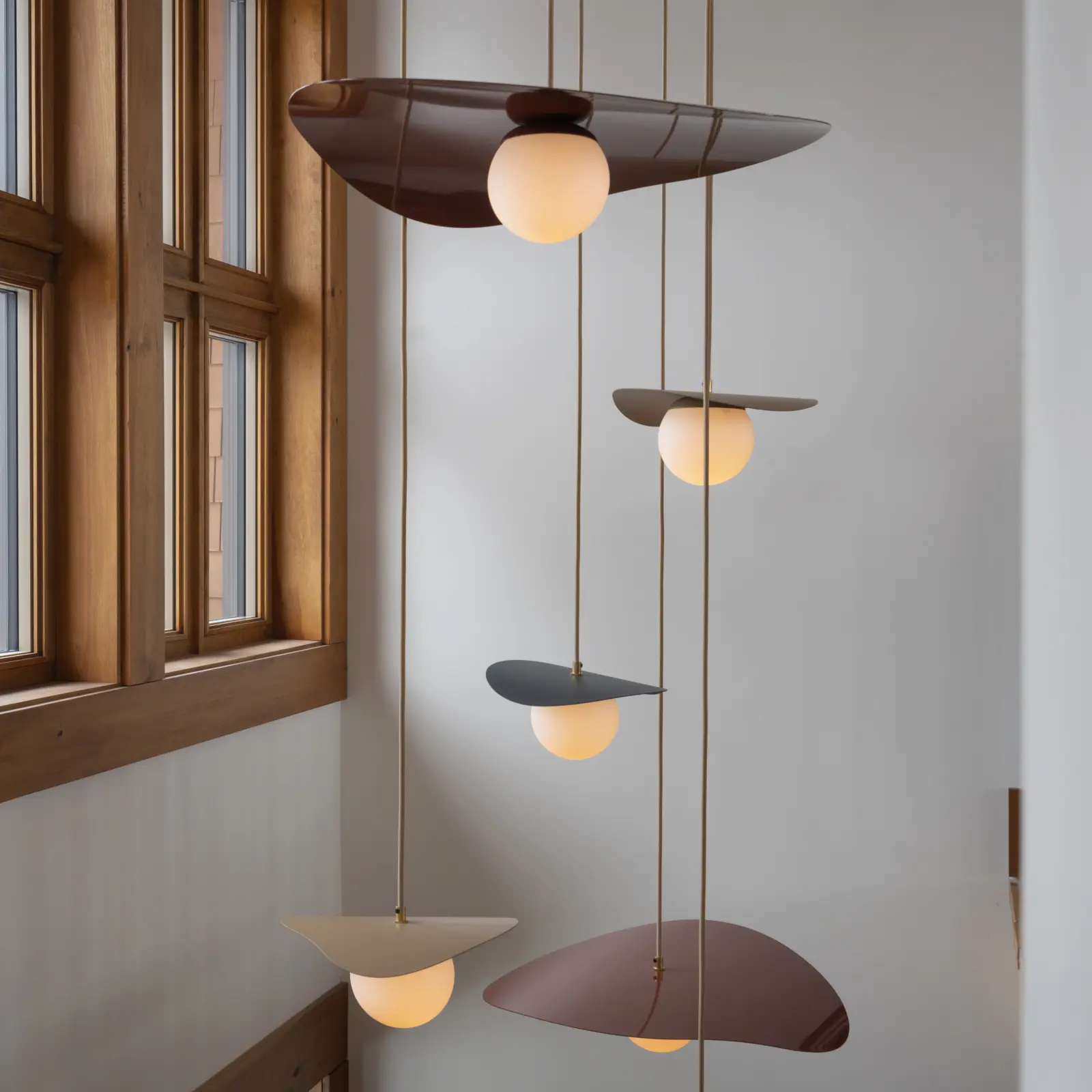 The SOPAL collection is a variation of the nopal shape where we added a slight curve on its main axis. This bending gives a feeling of lightness and softness to the lampshade. In addition, with its multiple installation possibilities, a sopal arrangement can take on a variety of appearances and suggest the fineness of flower petals or the movement of a bird flight.