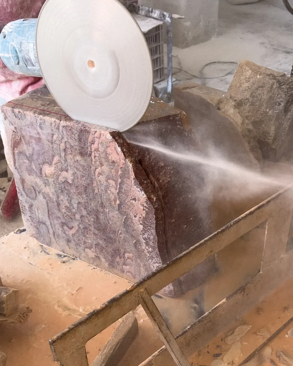 Cutting: The onyx stone is cut into rough blocks using diamond saws.