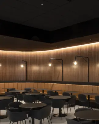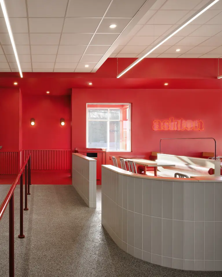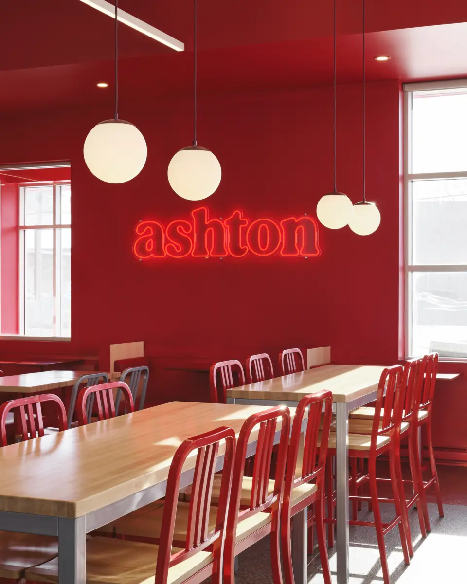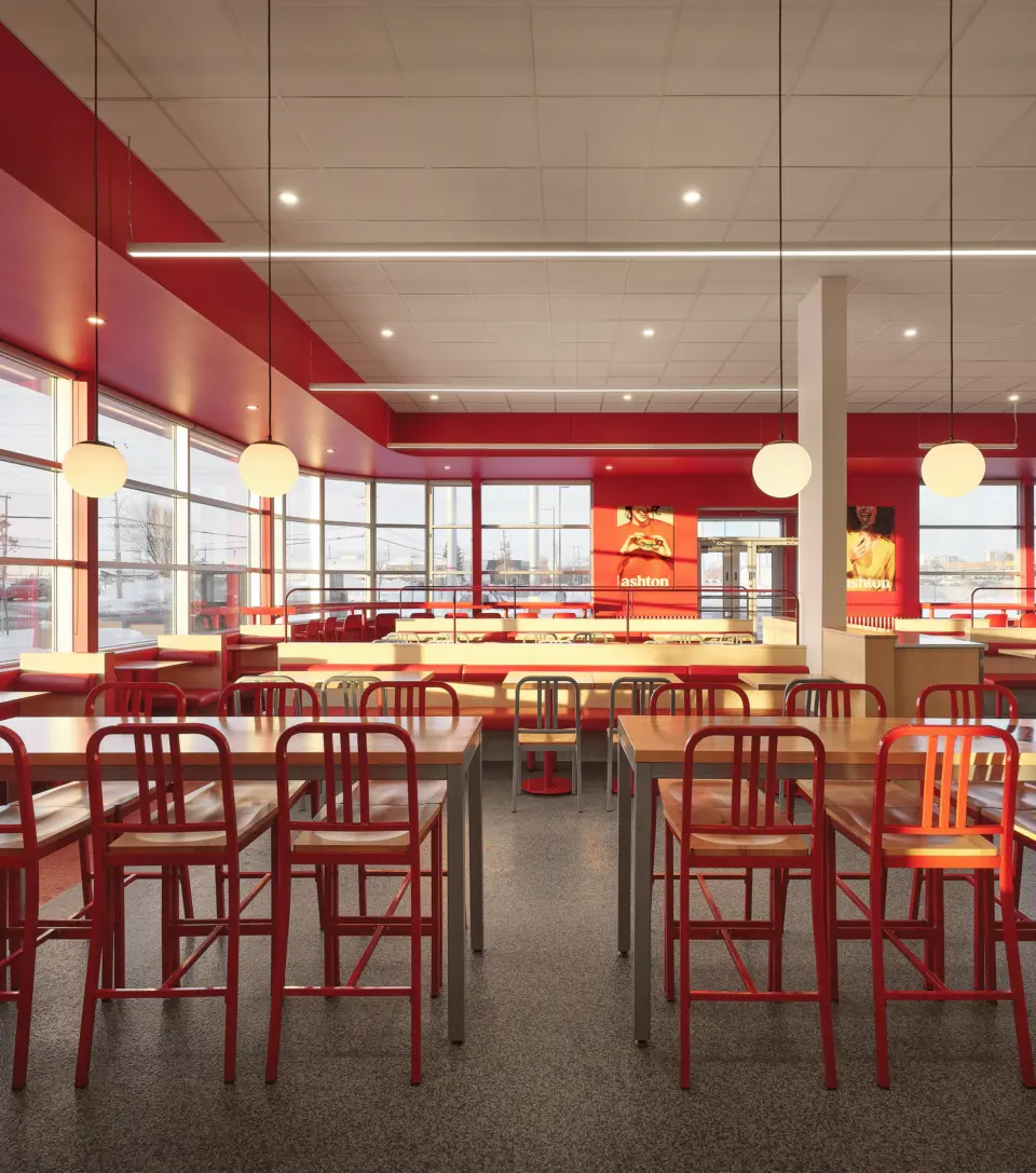 Ashton est la plus ancienne chaîne de restaurant servant la fameuse poutine Québécoise! En 2022, de jeunes entrepreneurs ont acquis les 23 succursales d'Ashton et ont entrepris de revamper le restaurant. Le choix judicieux des luminaires apporte une touche moderne, en mettant en vedette le ROUGE couleur de l'image de marque.