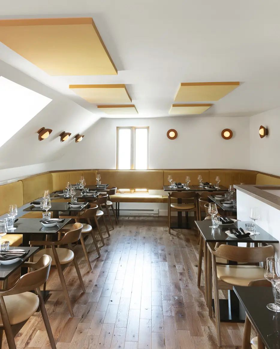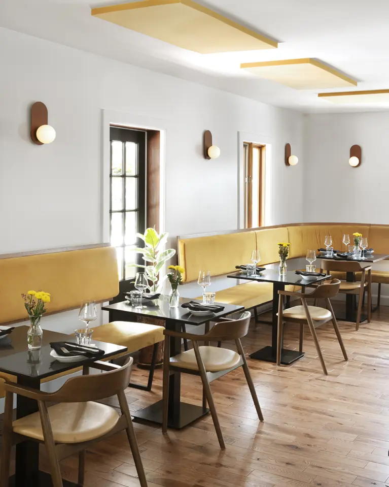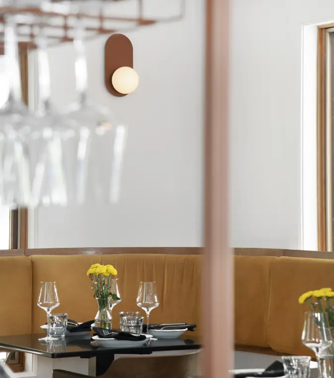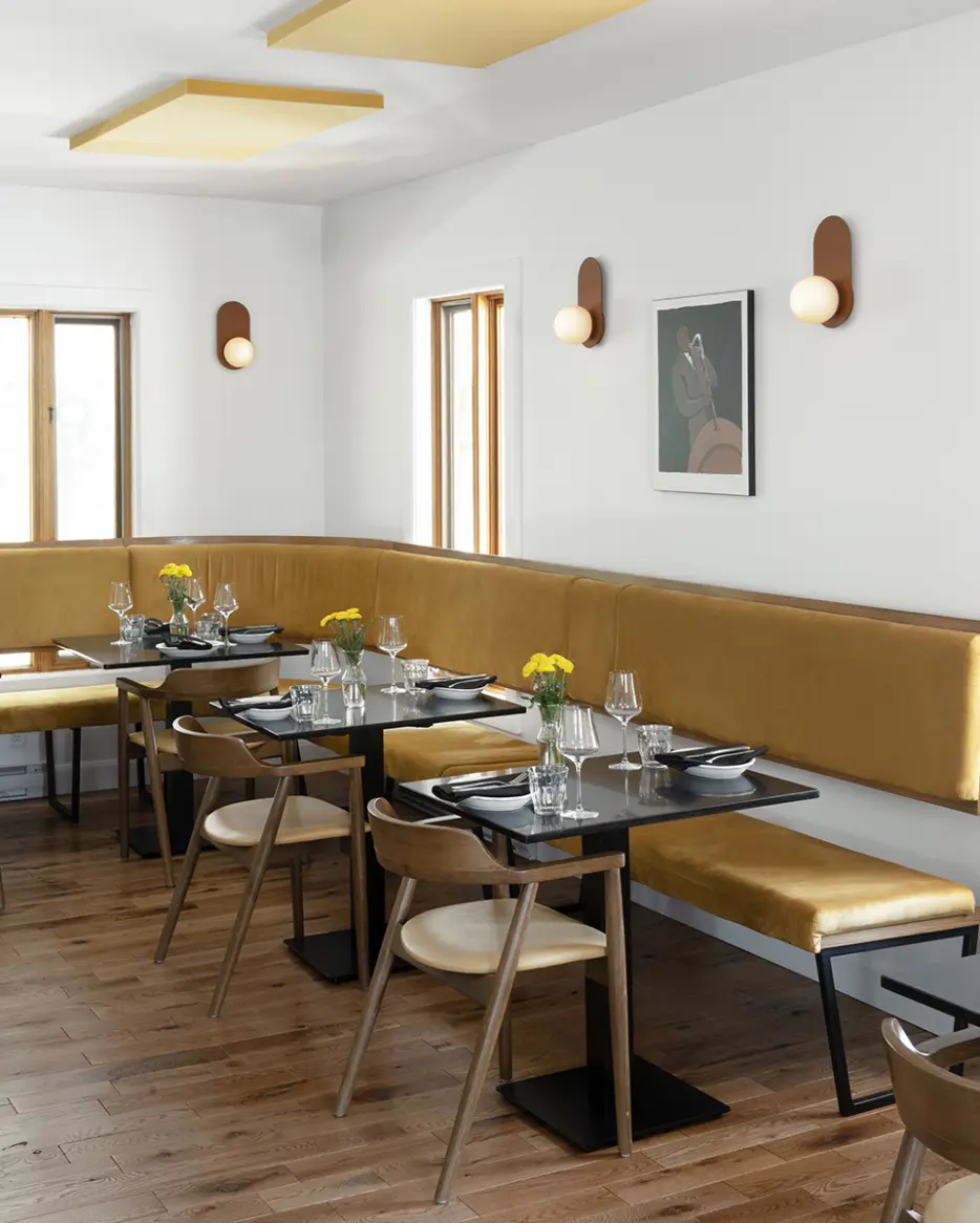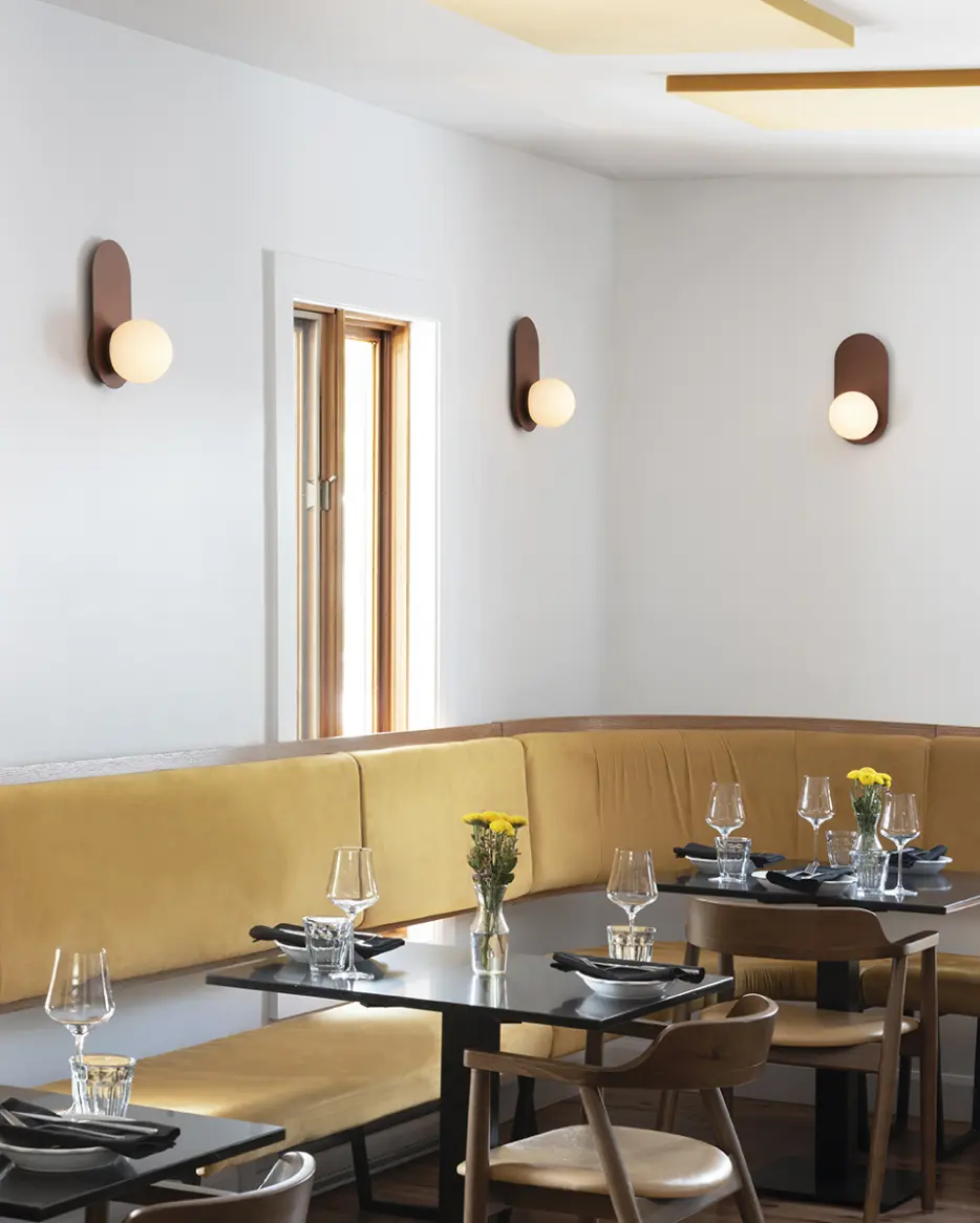 Babar Restaurant in Bromont presents an interior design that harmoniously blends Middle Eastern influences with contemporary aesthetics. The space features warm, earthy tones and natural materials, creating an inviting and cozy atmosphere. A notable element of the design is the strategic use of multiple wall fixtures by Luminaire Authentik, which provide soft, ambient lighting that enhances the restaurant's warm and welcoming ambiance. These fixtures not only illuminate the space but also serve as decorative elements that complement the overall design, contributing to a dining experience that is both comfortable and visually appealing.