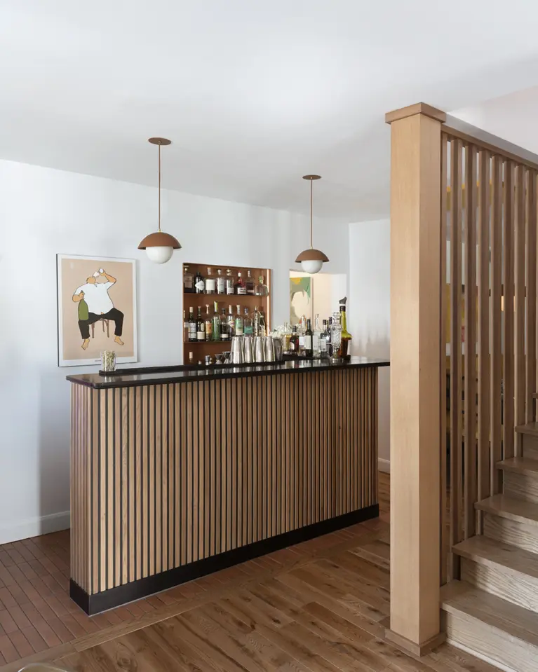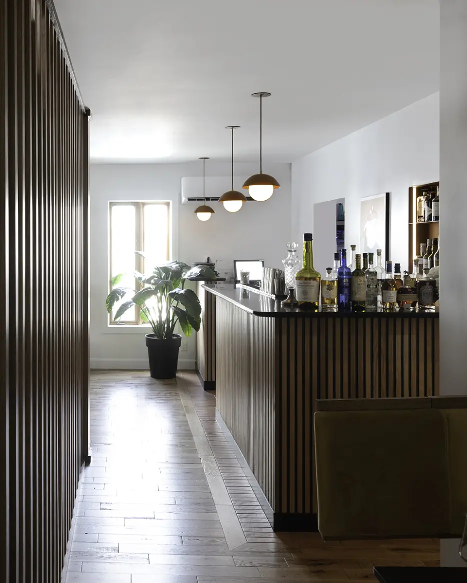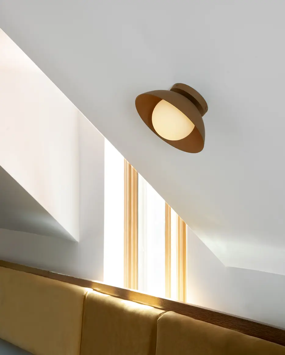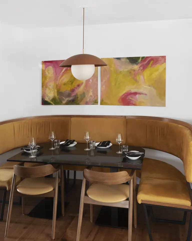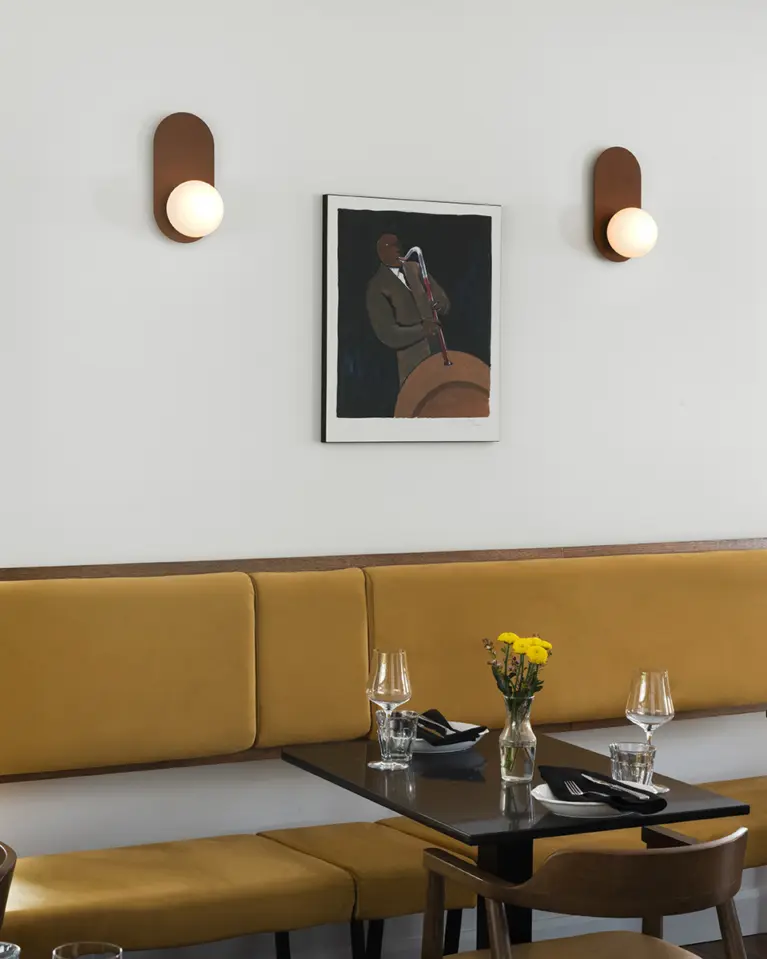 Babar Restaurant in Bromont presents an interior design that harmoniously blends Middle Eastern influences with contemporary aesthetics. The space features warm, earthy tones and natural materials, creating an inviting and cozy atmosphere. A notable element of the design is the strategic use of multiple wall fixtures by Luminaire Authentik, which provide soft, ambient lighting that enhances the restaurant's warm and welcoming ambiance. These fixtures not only illuminate the space but also serve as decorative elements that complement the overall design, contributing to a dining experience that is both comfortable and visually appealing.