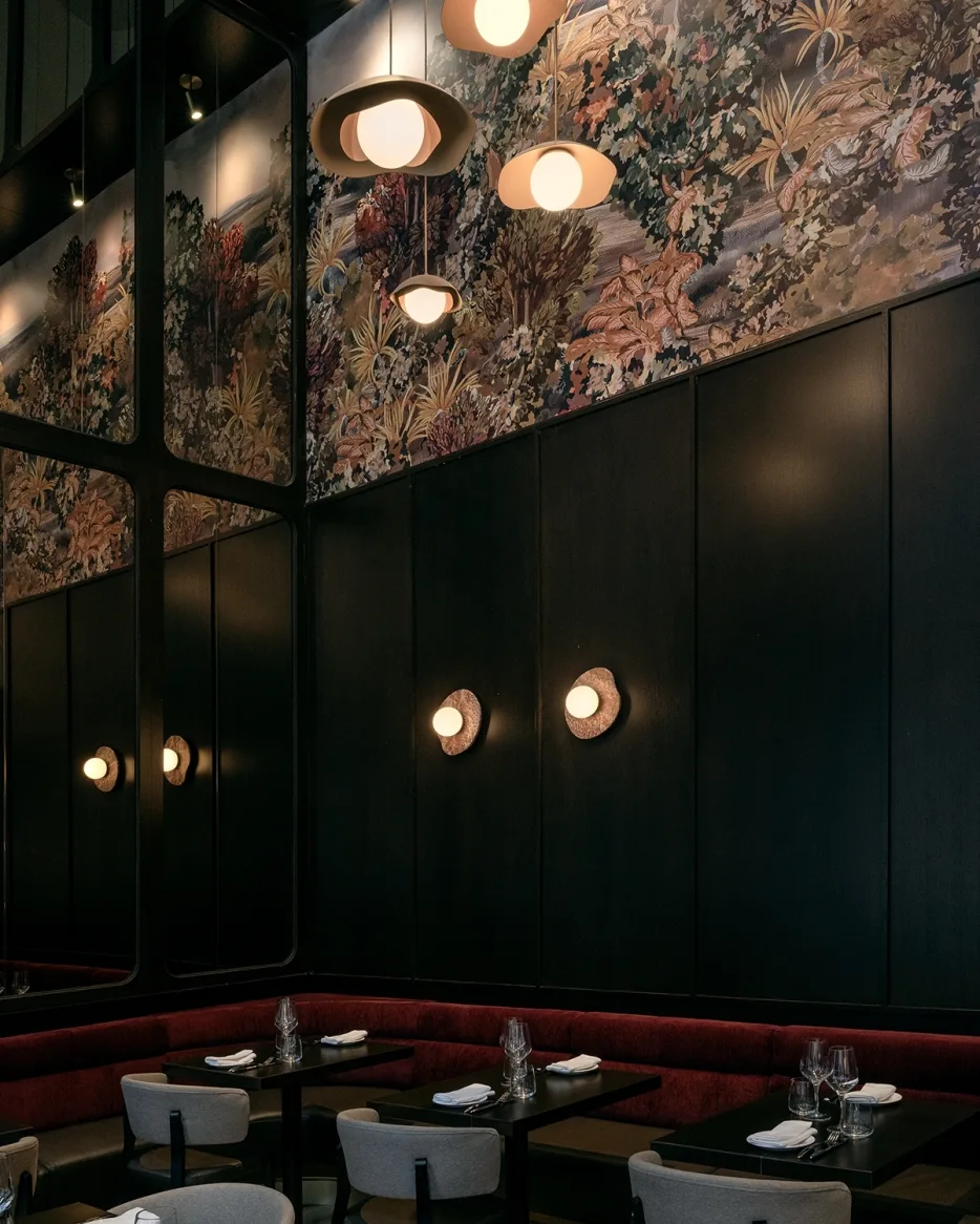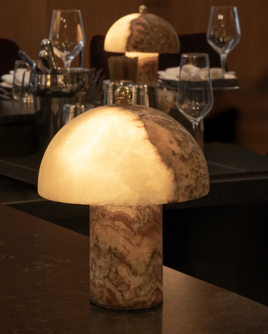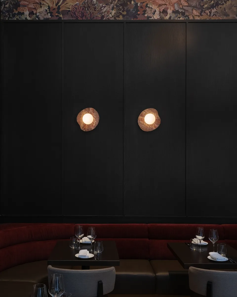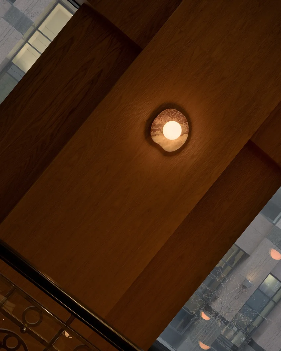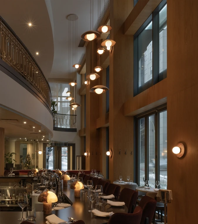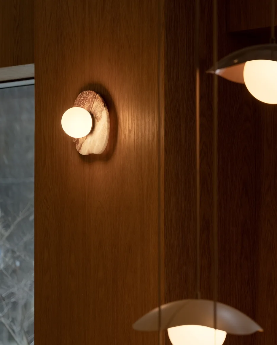 Within this setting, the Pivoine collection integrates naturally with the rich materials and deep tones of the space. It diffuses a soft light that enhances the intimacy of the environment without overpowering it. It also pairs seamlessly with the Onyx collection, whose materiality adds a more grounded presence and completes the overall balance of the space.