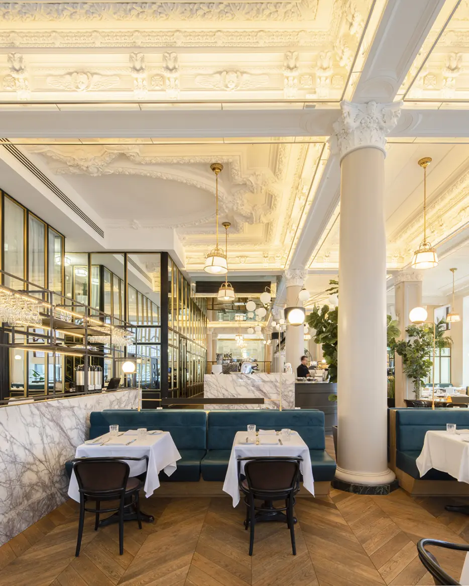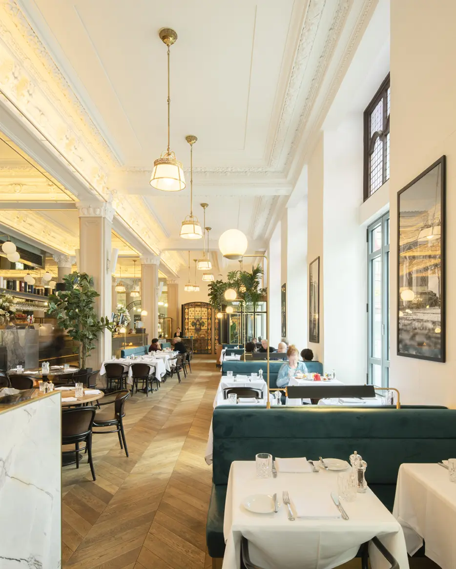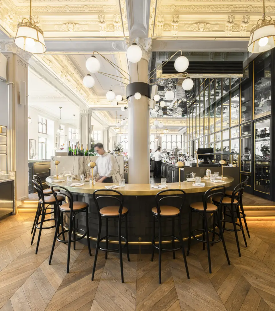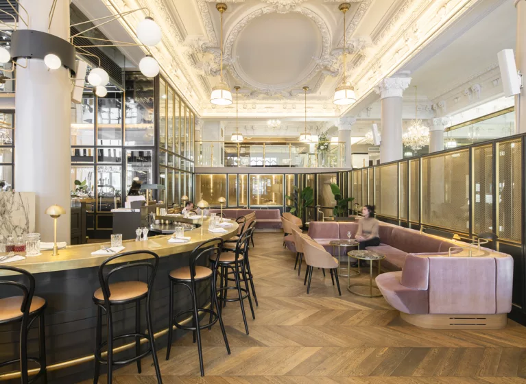 Henri Brasserie Française, located in the heart of the Hôtel Birks, seamlessly blends historic charm with modern elegance. Designed by Atelier Zébulon Perron, the interior highlights restored stained glass windows, ornate ceilings, brass accents, velvet banquettes, and a stunning marble bar. Featuring an elaborate and creative custom lighting system, our fixtures bring elegance and warmth to this grand architectural space.
