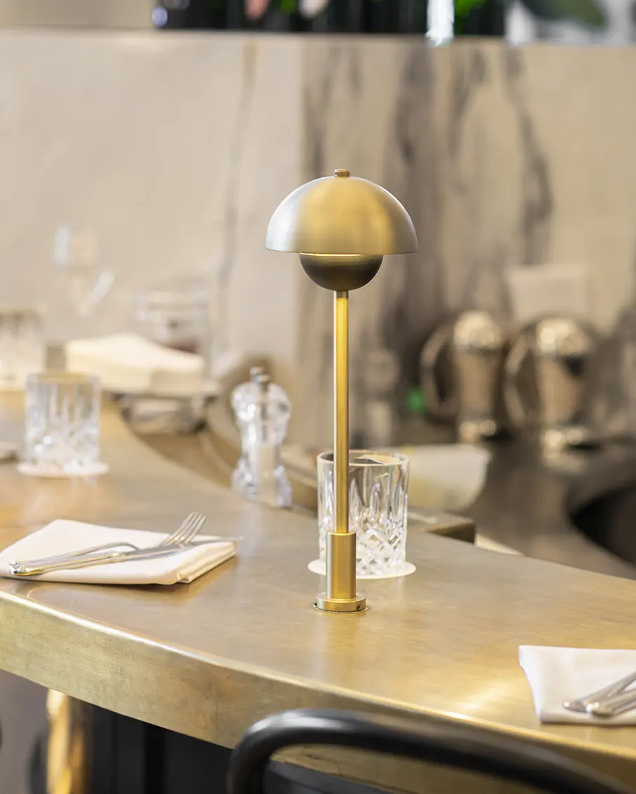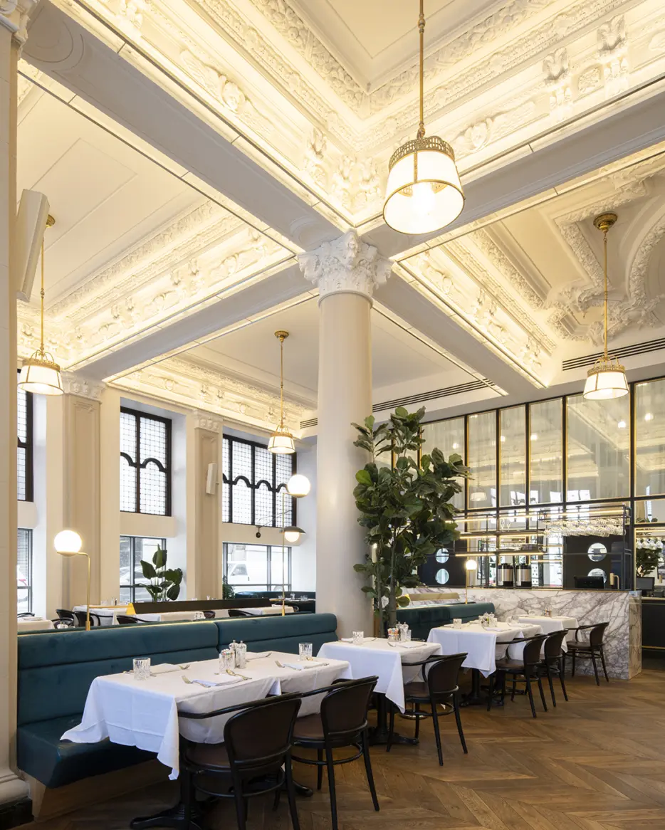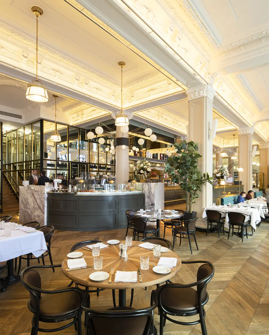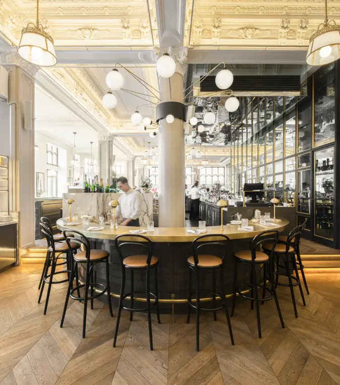 Henri Brasserie Française, located in the heart of the Hôtel Birks, seamlessly blends historic charm with modern elegance. Designed by Atelier Zébulon Perron, the interior highlights restored stained glass windows, ornate ceilings, brass accents, velvet banquettes, and a stunning marble bar. Featuring an elaborate and creative custom lighting system, our fixtures bring elegance and warmth to this grand architectural space.
