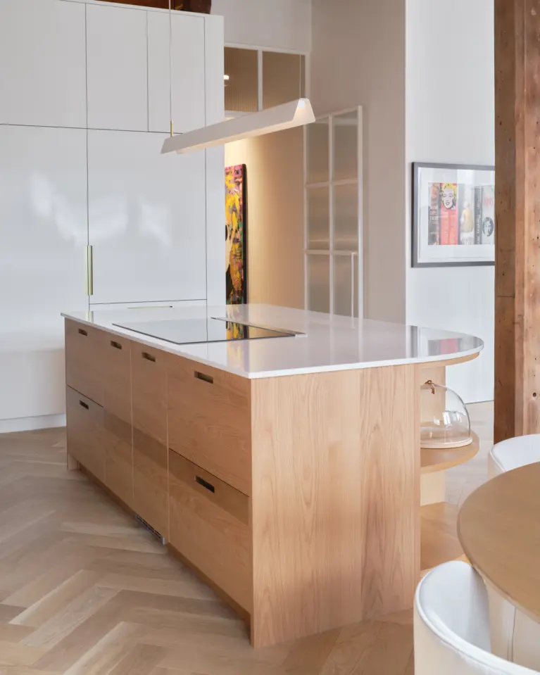 This bright kitchen-dining area combines light wood, white seating, and golden brass for a modern yet warm atmosphere. The exposed beams add character that does not go unnoticed.
