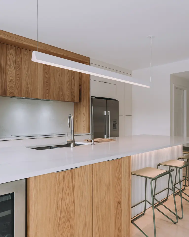 The Frankfort Project, located in Gatineau, is a creation by Pamela Pryce, founder of pure d.co. This residential project features a sleek and modern interior design, incorporating high-quality materials and contemporary lines. Luminaire Authentik's lighting adds a touch of elegance and functionality, creating a warm and sophisticated atmosphere.
