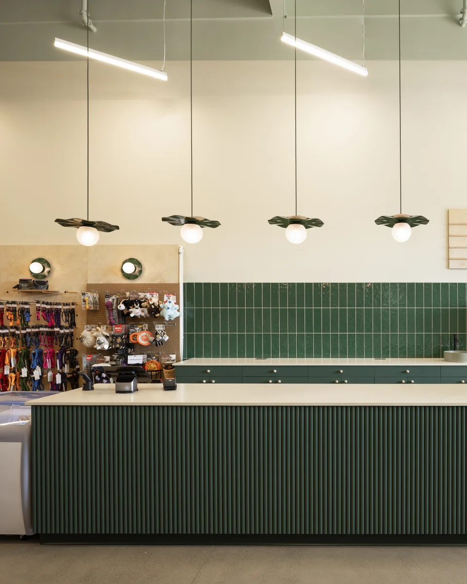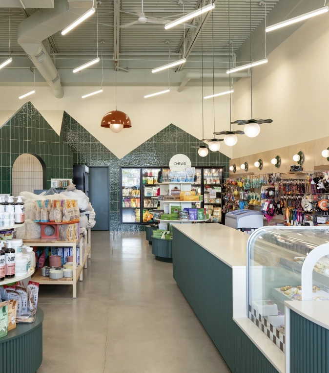 Designed by the AMCA studio, the Higgie’s Pet Mercantile project stands out for its warm atmosphere and distinctive identity, inspired by both specialty cafés and early 20th-century general stores.