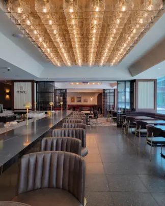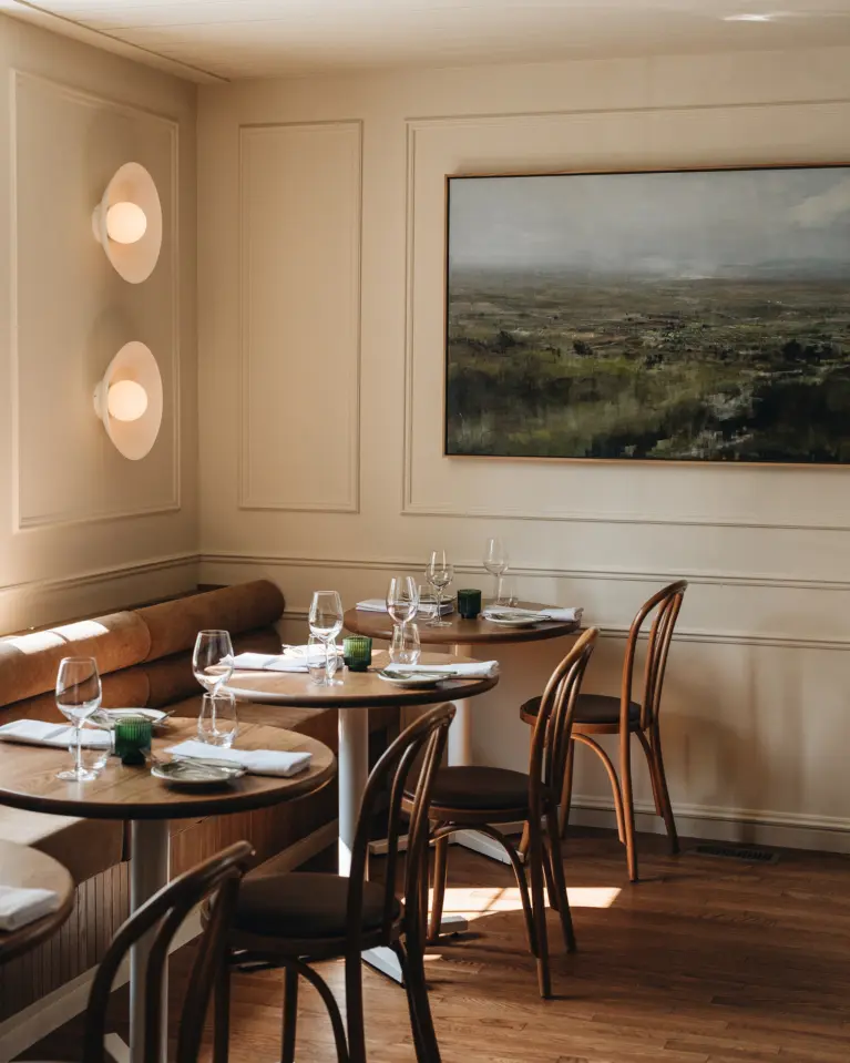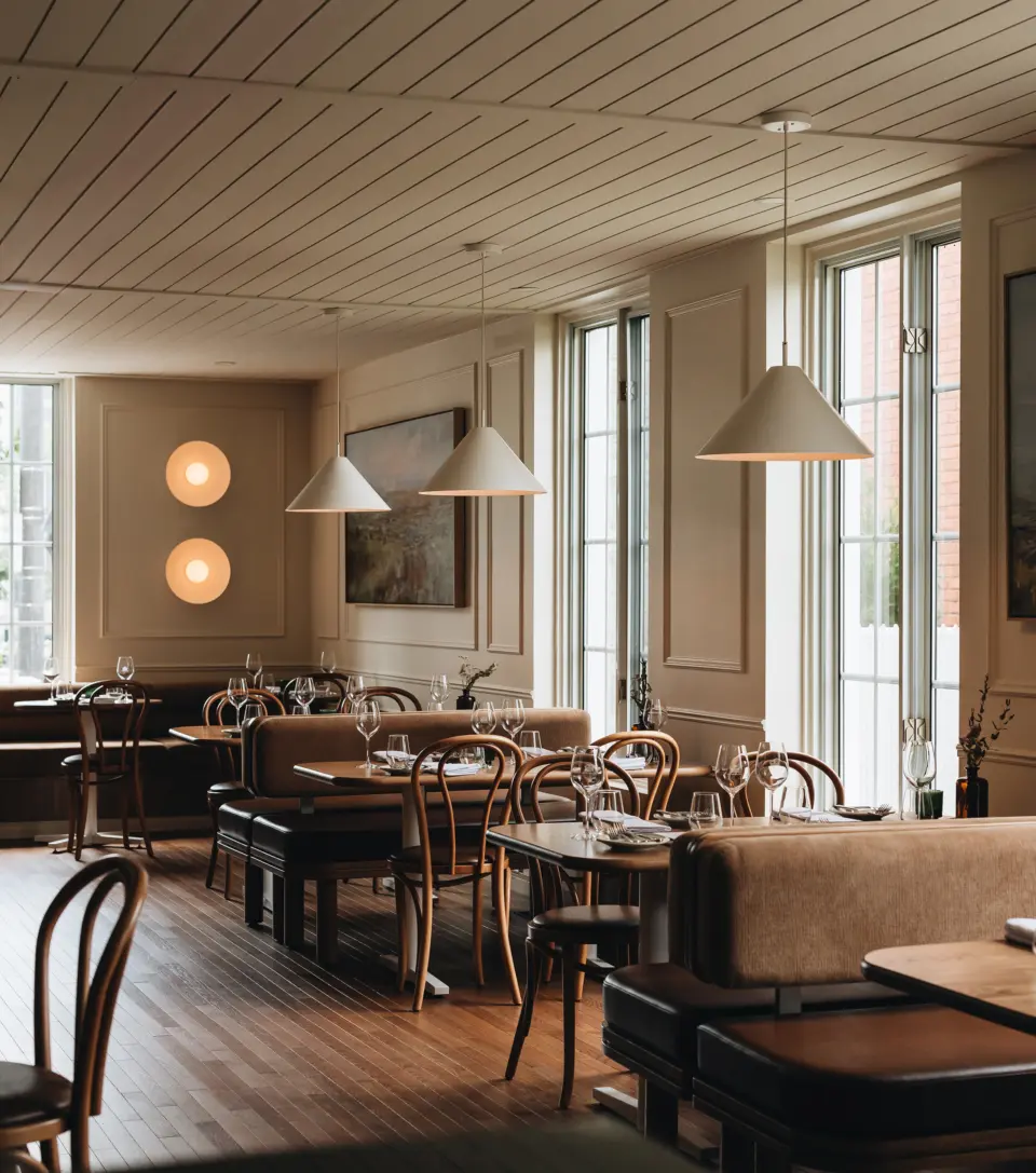 The design concept of Restaurant Le Manseau blends modernity and authenticity in perfect harmony. The space features noble materials like wood, metal, and stone, creating a warm and contemporary ambiance. Clean lines and subtle decorative accents enhance the elegance of the setting, while carefully designed lighting highlights textures and architectural details.