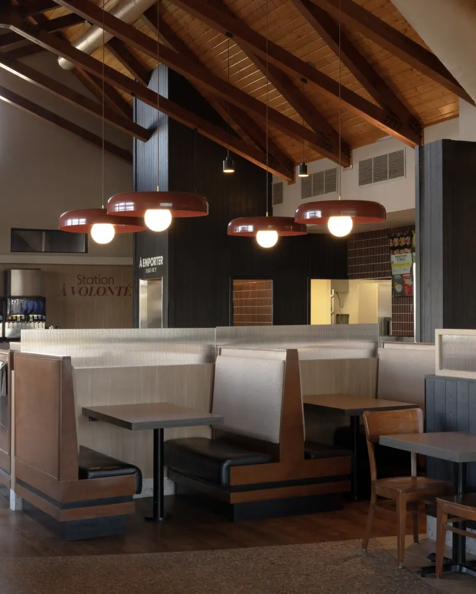The St-Hubert restaurant stands out as a gathering place that highlights the warm identity of Quebec through a lively, textured, and colorful interior design.
