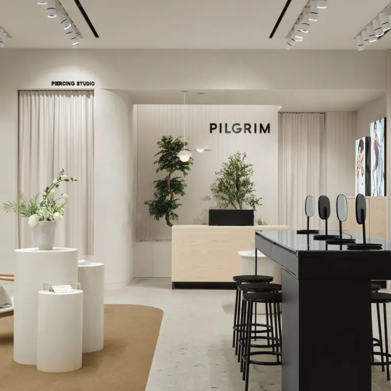 The space balances functionality and aesthetic appeal, providing a seamless shopping experience that aligns with Pilgrim's ethos of authenticity and timeless style. Every element, from fixtures to furnishings, reflects a commitment to quality, craftsmanship, and understated sophistication.