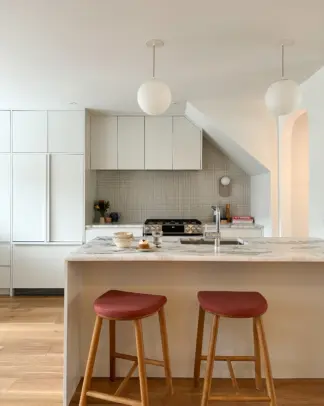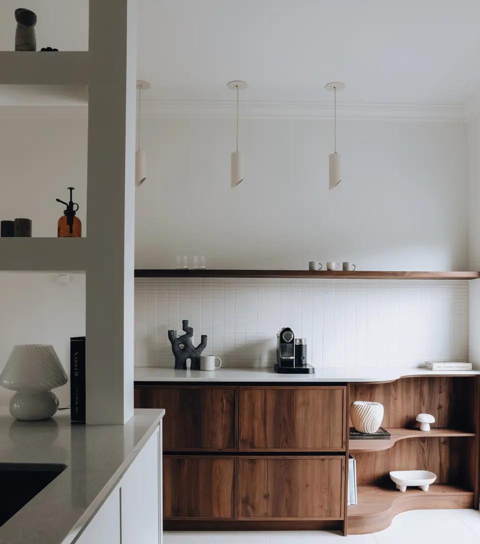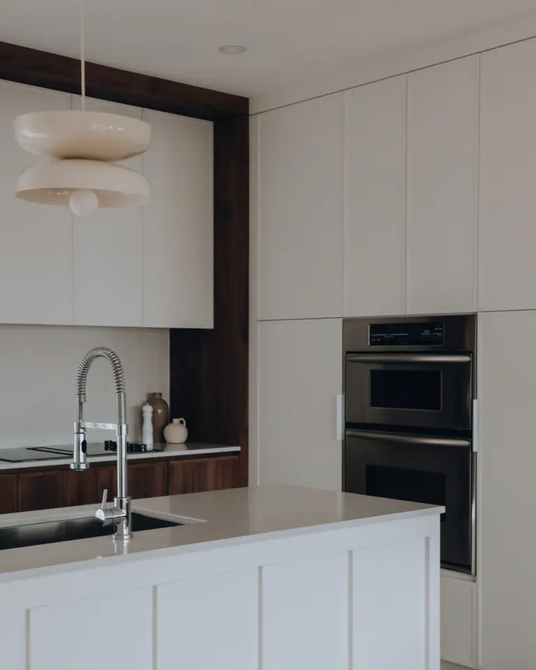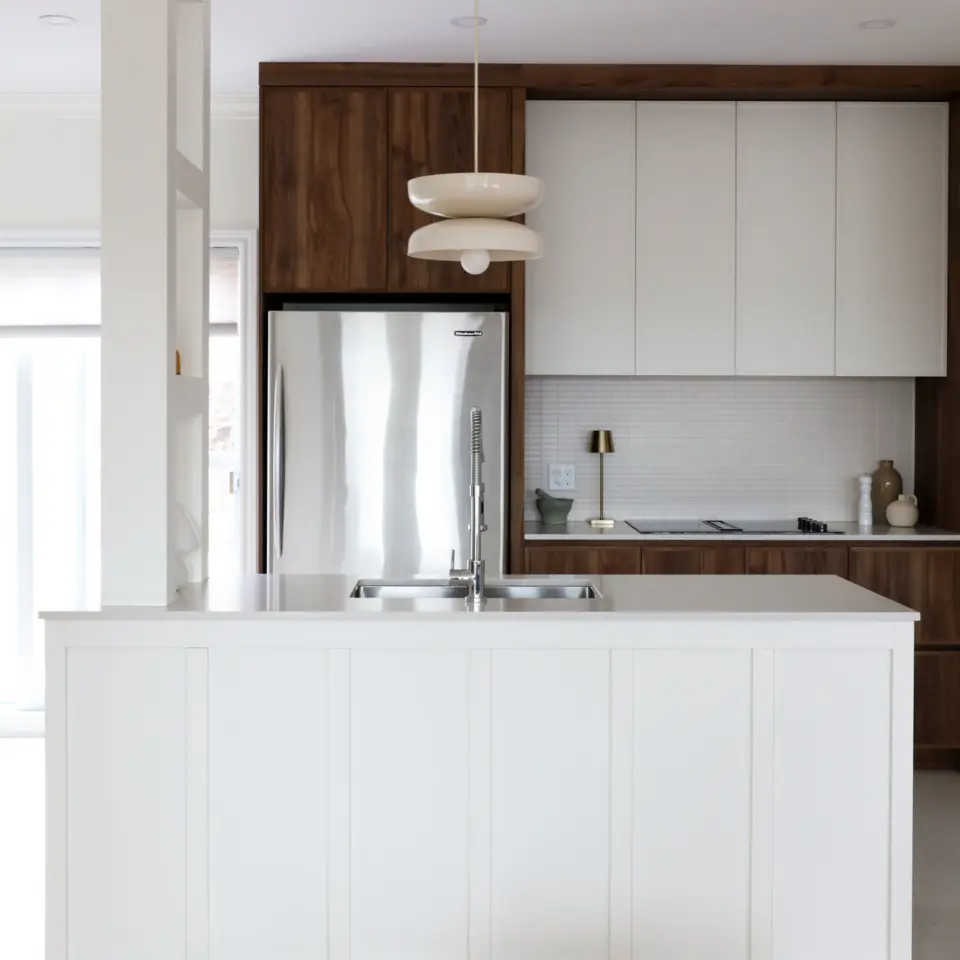 Located in Montreal, the Gary-Carter Project is a complete condo renovation, including the kitchen, coffee corner, and living room. Orchestrated by Atelier Dansereau, this turnkey project covered everything from measurements and design to construction management and final delivery. The design draws inspiration from mid-century modern style, featuring distinctive elements like a rounded coffee corner unit, blending functionality and aesthetic harmony.