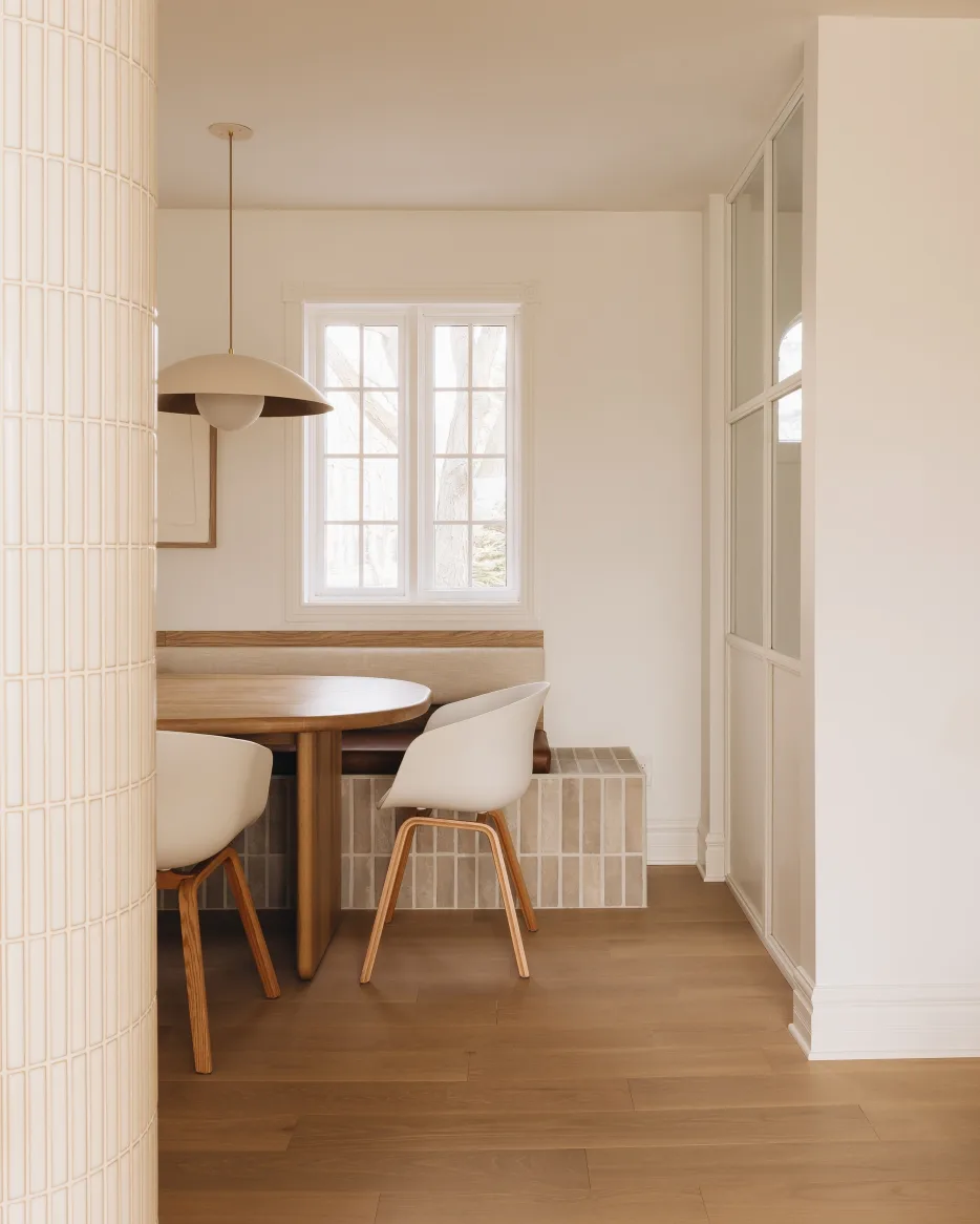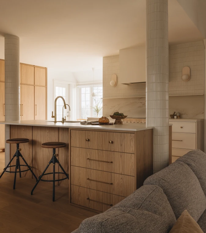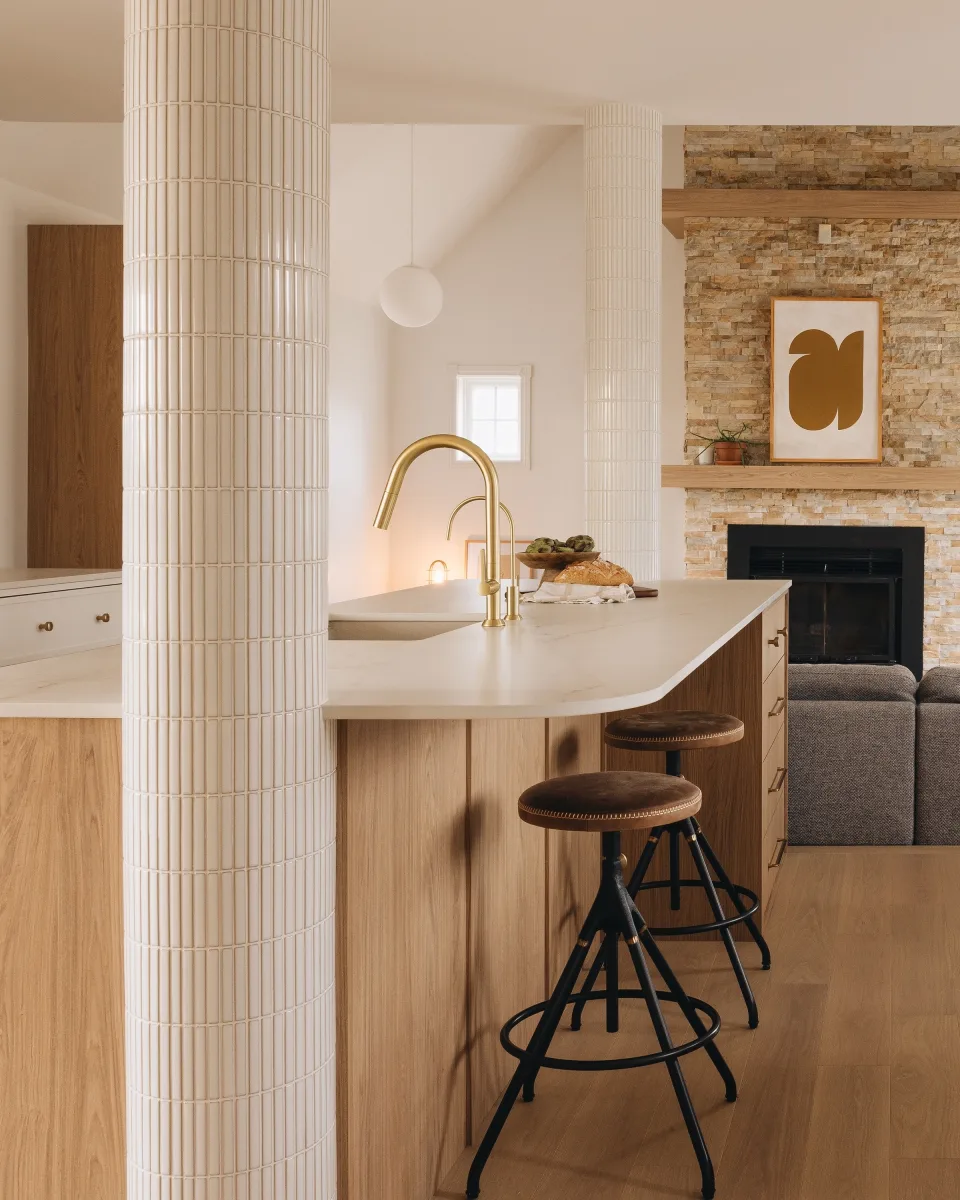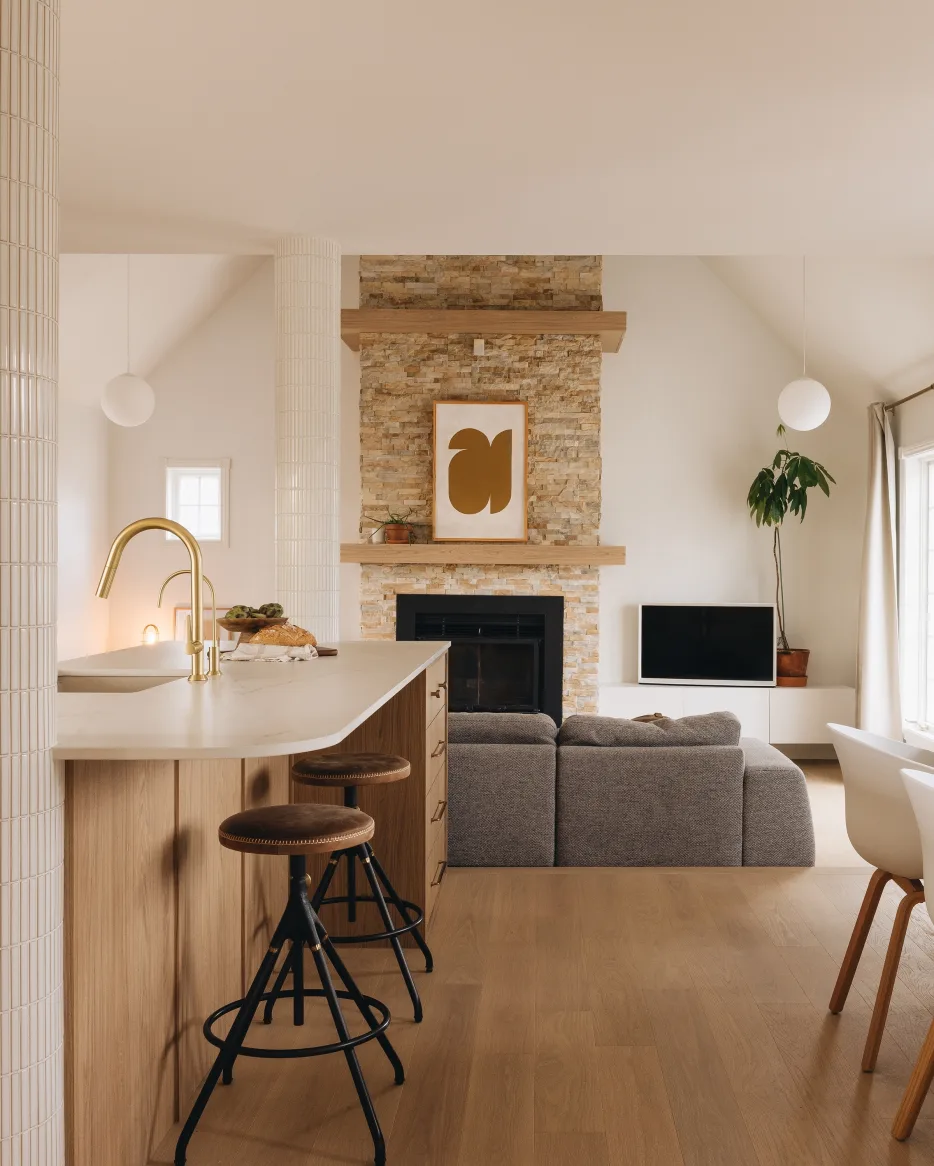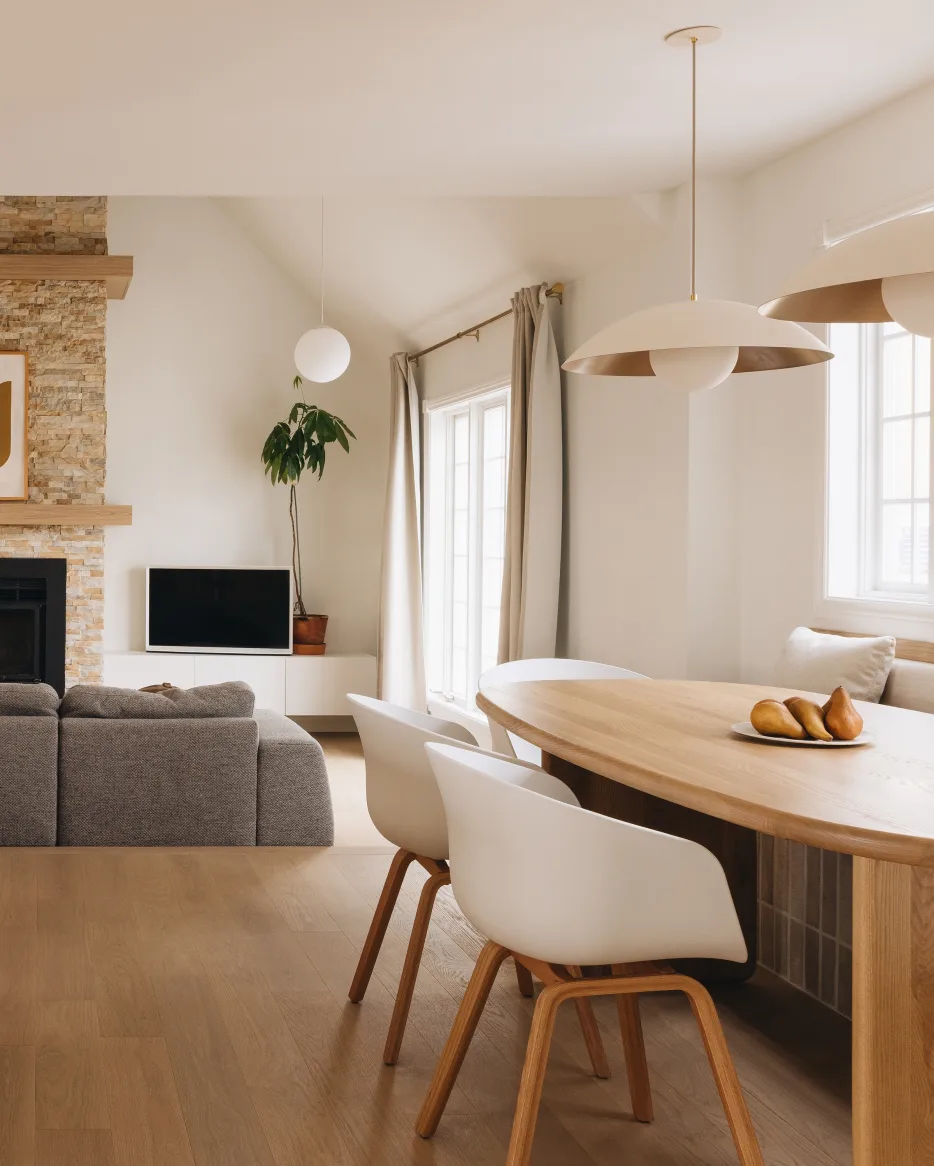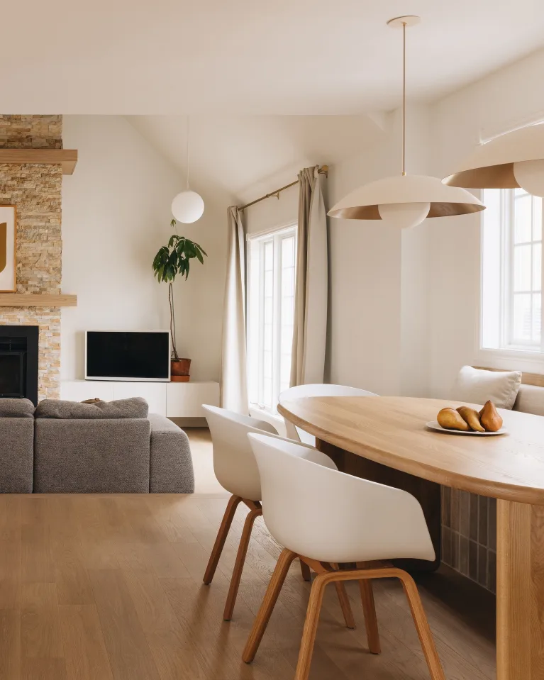 Dans cet espace lumineux, les luminaires s’intègrent naturellement à l’architecture et aux matières environnantes. Les formes simples et les lignes épurées laissent toute la place aux textures du bois, de la pierre et des surfaces minérales, tout en diffusant une lumière douce et enveloppante. Les touches d'or ajoutent une chaleur subtile qui vient souligner les volumes et enrichir l’ambiance, créant un équilibre harmonieux entre design contemporain et matériaux intemporels.
