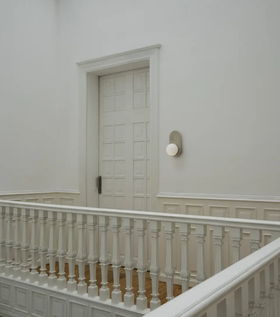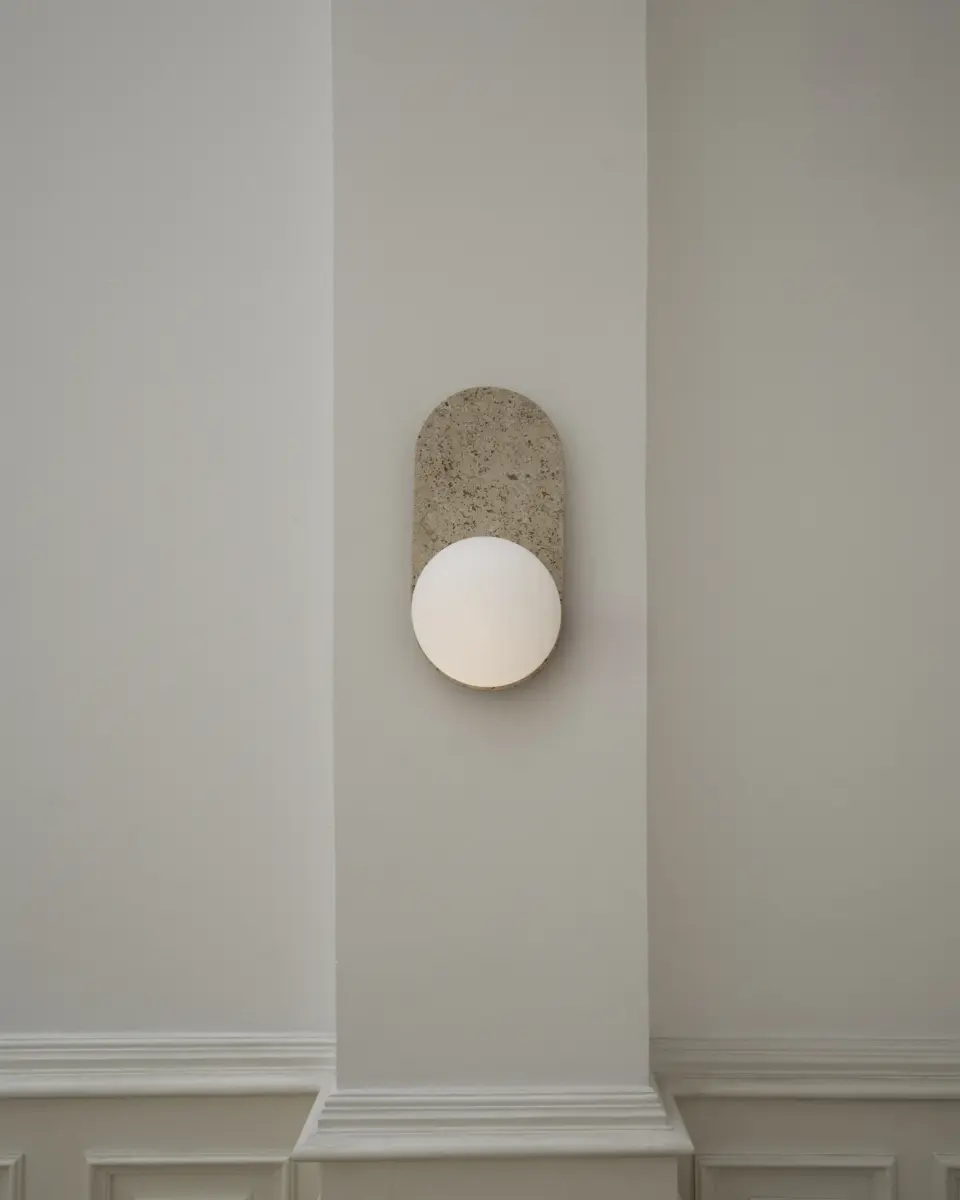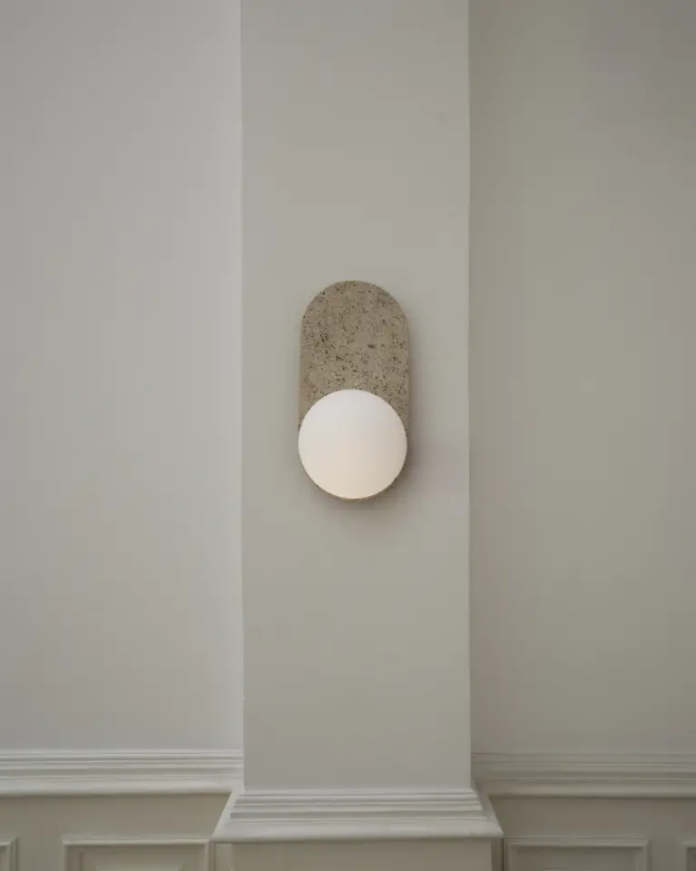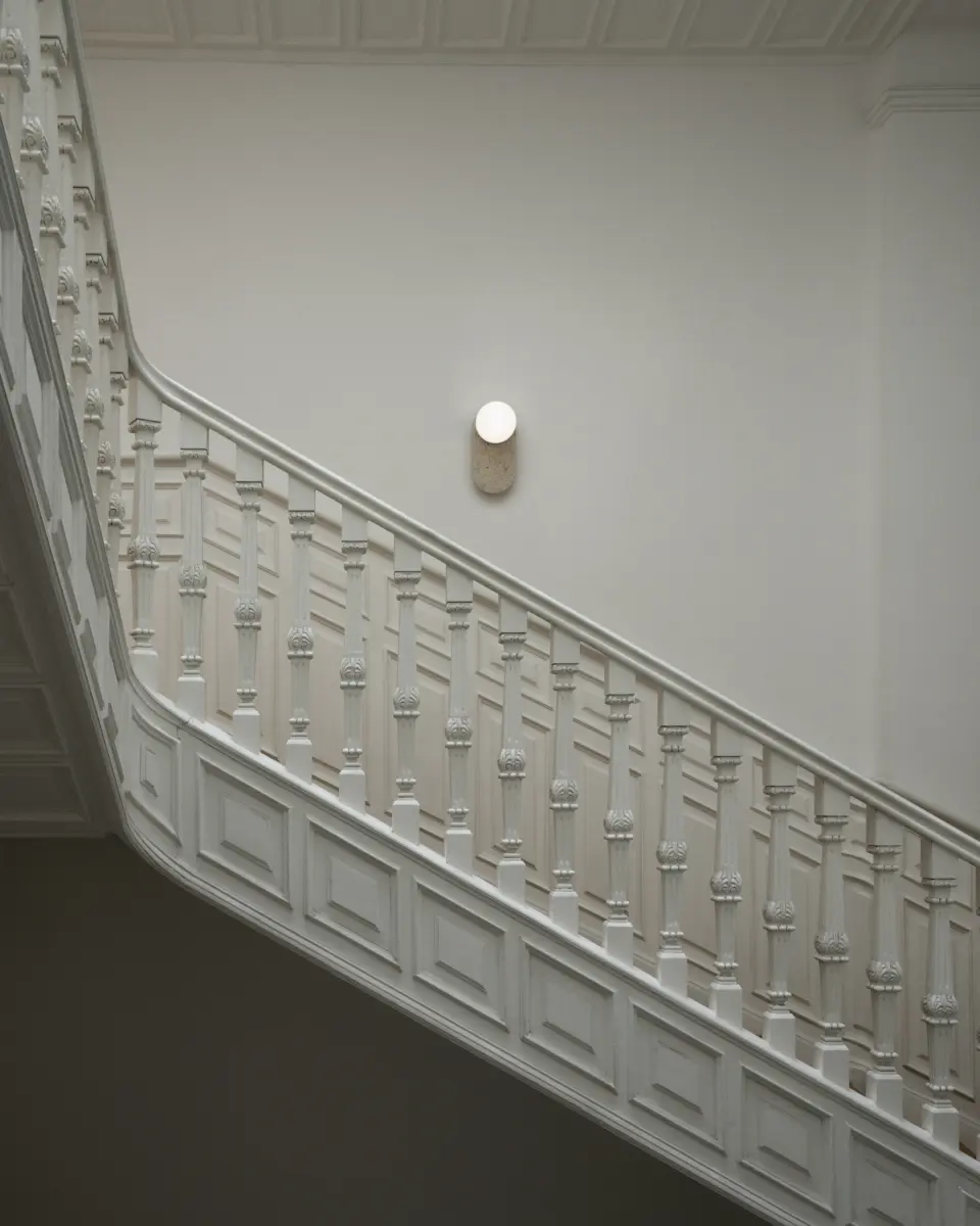 Classic and minimalist, this interior features elegant architecture, but is modernized by its simplicity and the choice of well-planned lighting. The wall light's clean, organic design contrasts subtly with the traditional architecture, creating a dialogue between ancient and modern. Free from decorative excess, the space feels open and balanced, with each element intentionally placed.
