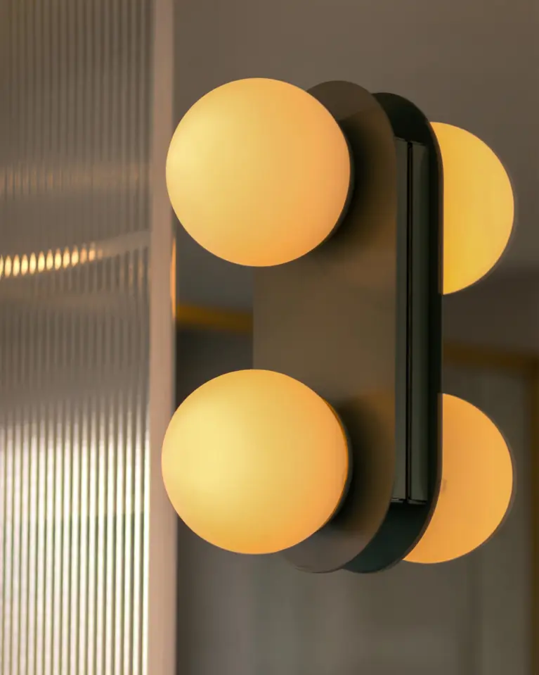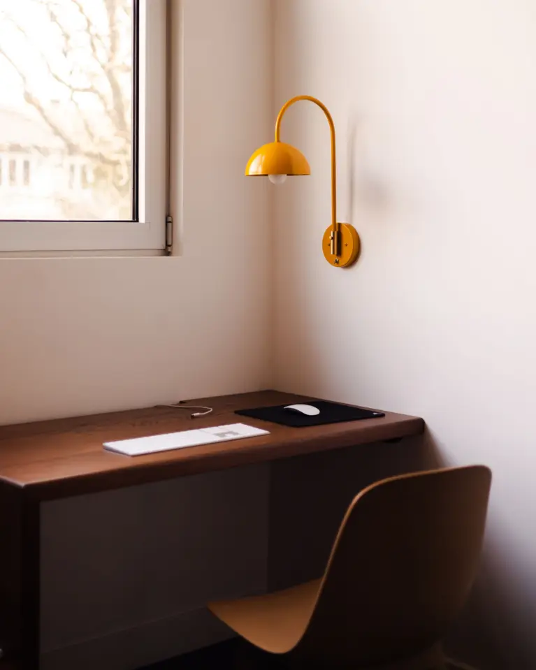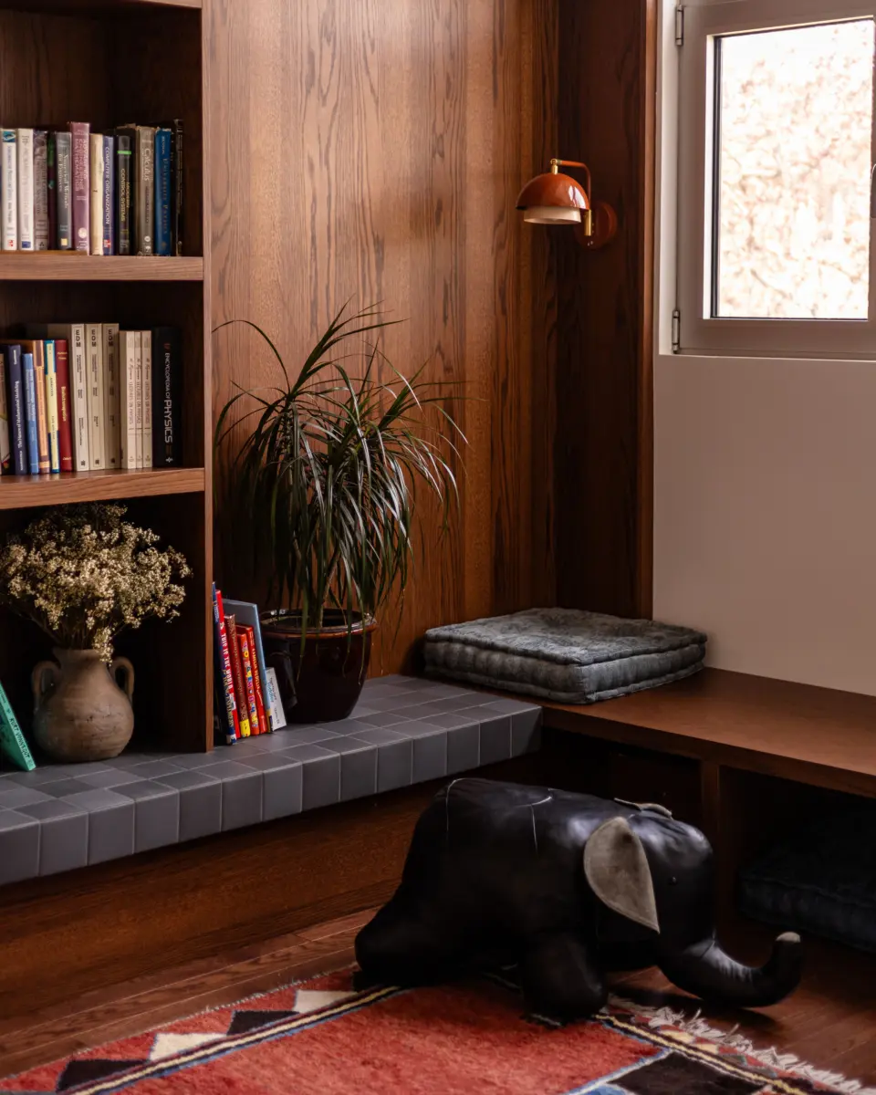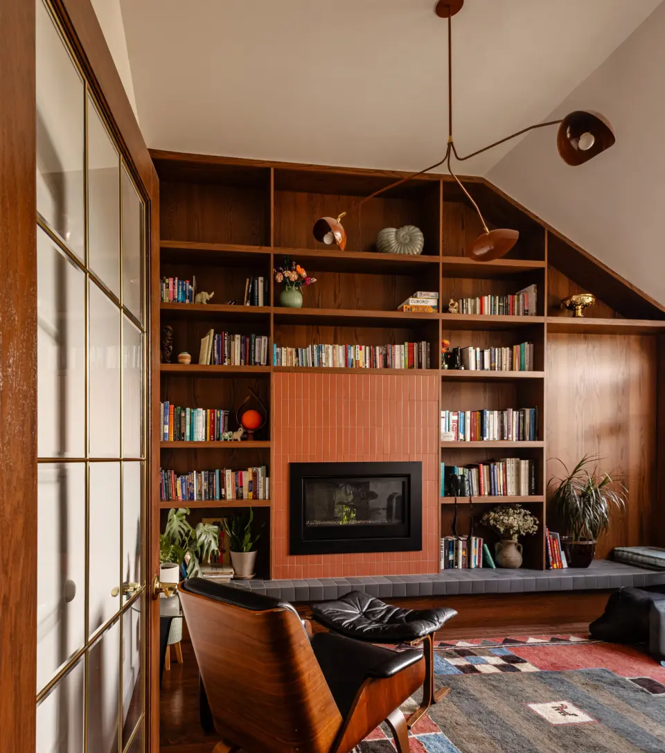 Here is a magnificent mid-century design project where the lighting fixtures perfectly complement the retro style of the room. A warm and cozy living room with its built-in wooden bookcase and central terracotta tile fireplace. We love it!
