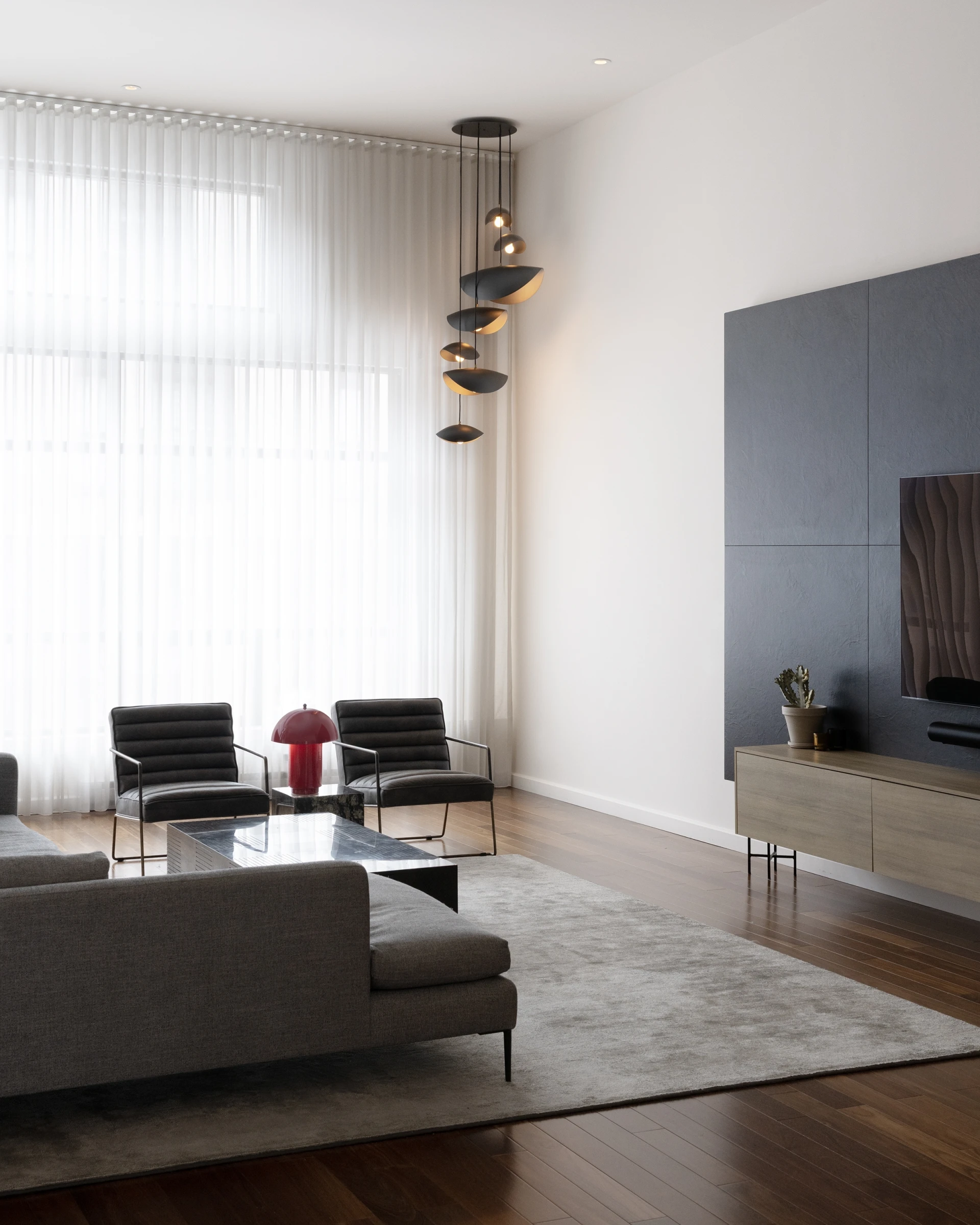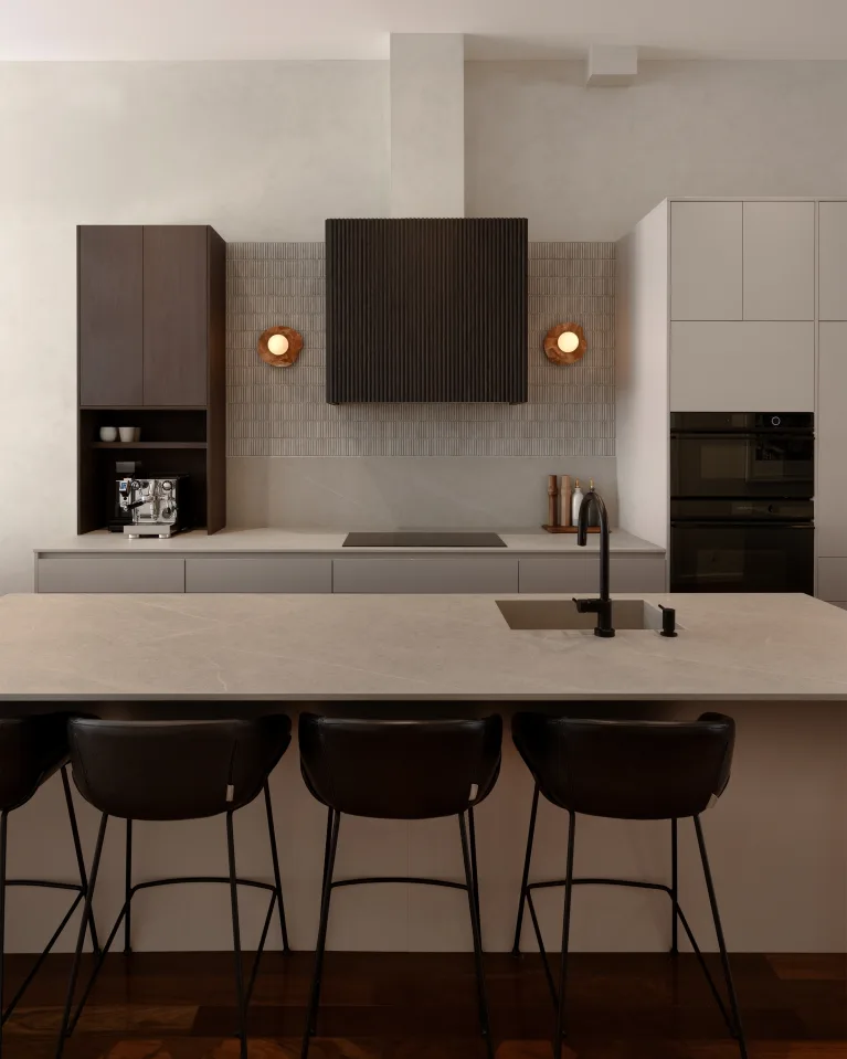 Located in Montreal, P.O. Beaudoin's home stands out for its refined yet warm approach. Determined to showcase Quebec craftsmanship, the designers skillfully incorporated different models and shades of lighting fixtures, creating harmonious continuity with the space. This thoughtful composition contributes to the balance of the decor and the coherence of the whole, while highlighting the identity of the project.