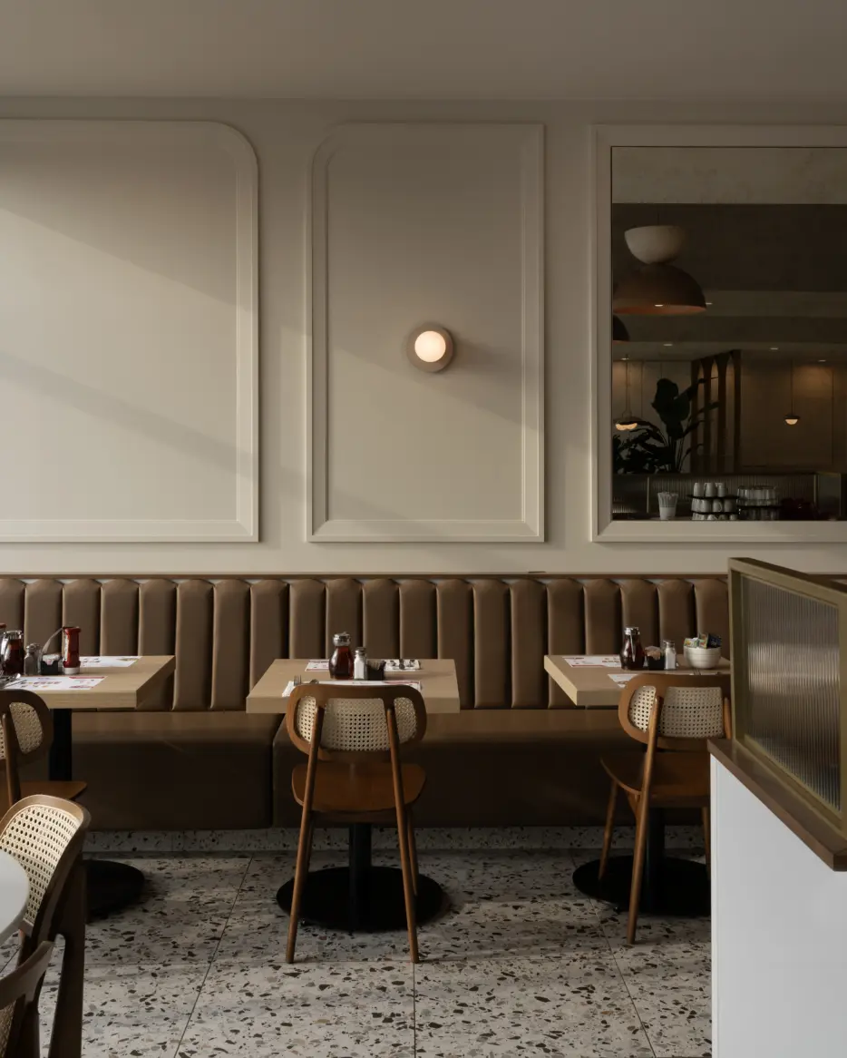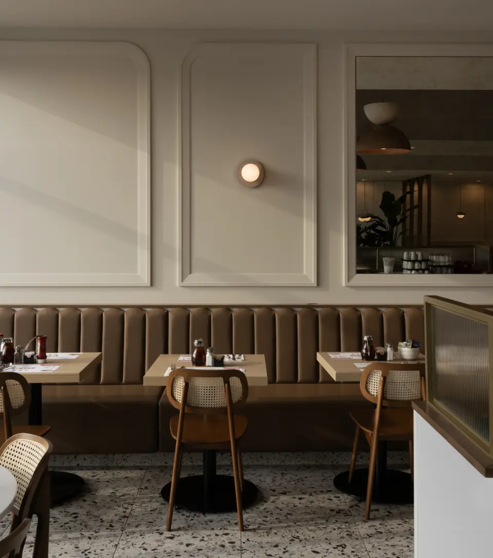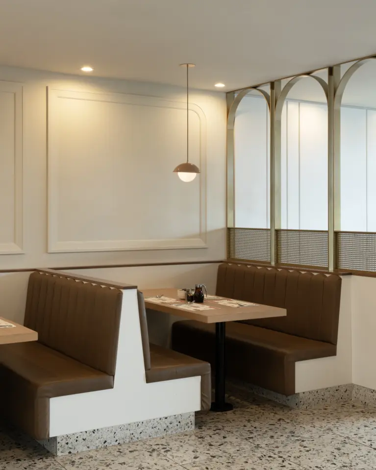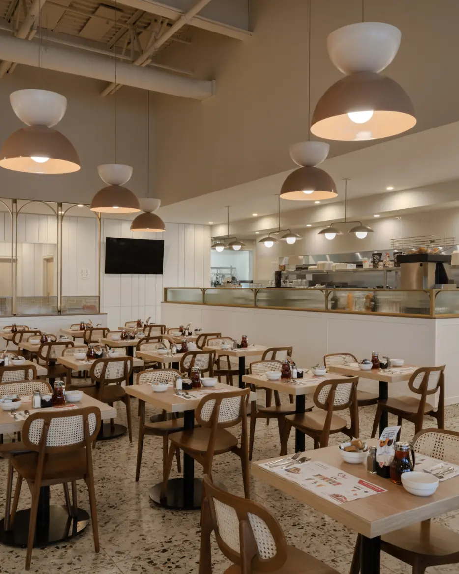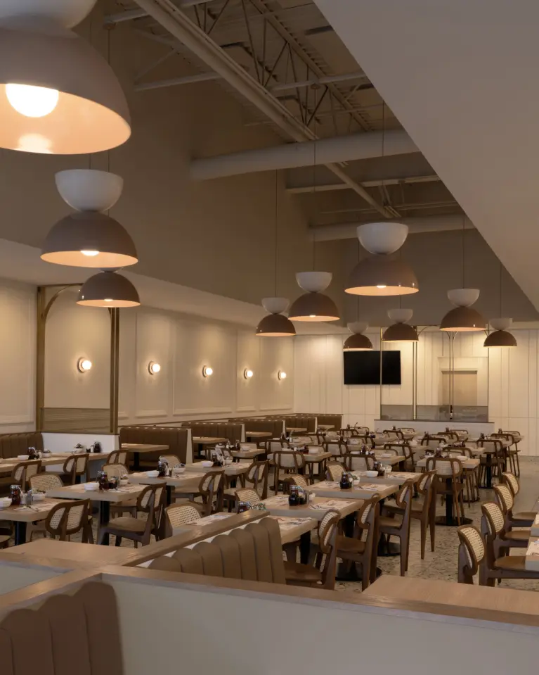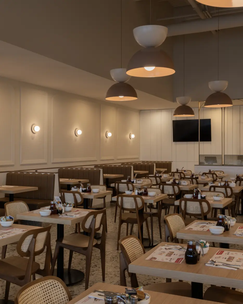 Petinos restaurants stand out for their wide selection of high-quality breakfasts. The Montreal North location has refreshed its decor with a selection of minimalist, carefully curated lighting fixtures that cast a soft, pleasant glow, perfect for enhancing the space.