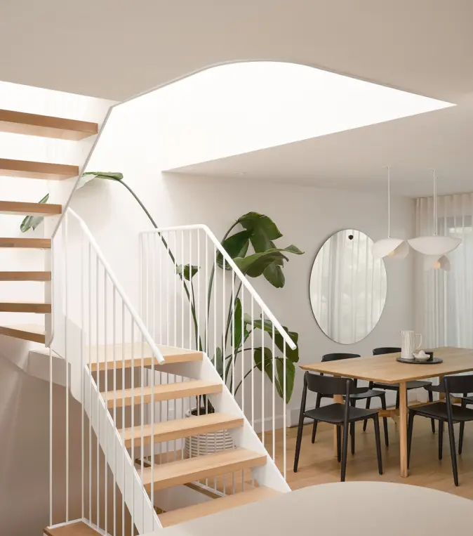 The Wilson Project by Entre Quatre Murs transforms a 1982 townhouse on Nuns' Island into a luminous, modern space. Featuring an open floor plan, custom cabinetry, and a sculptural staircase, the design blends warm wood tones and sleek quartz surfaces. This award-winning renovation perfectly balances modern aesthetics with comfort while respecting the home's architectural heritage.