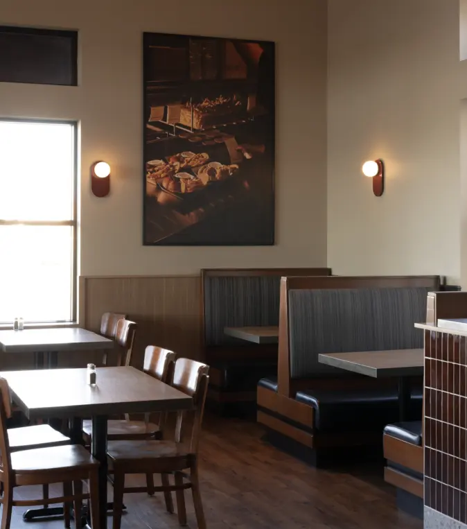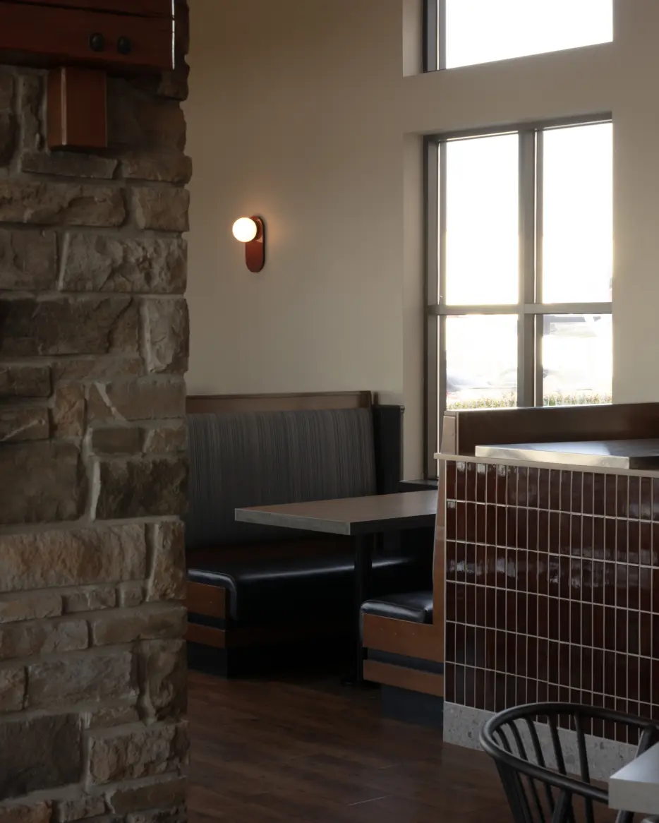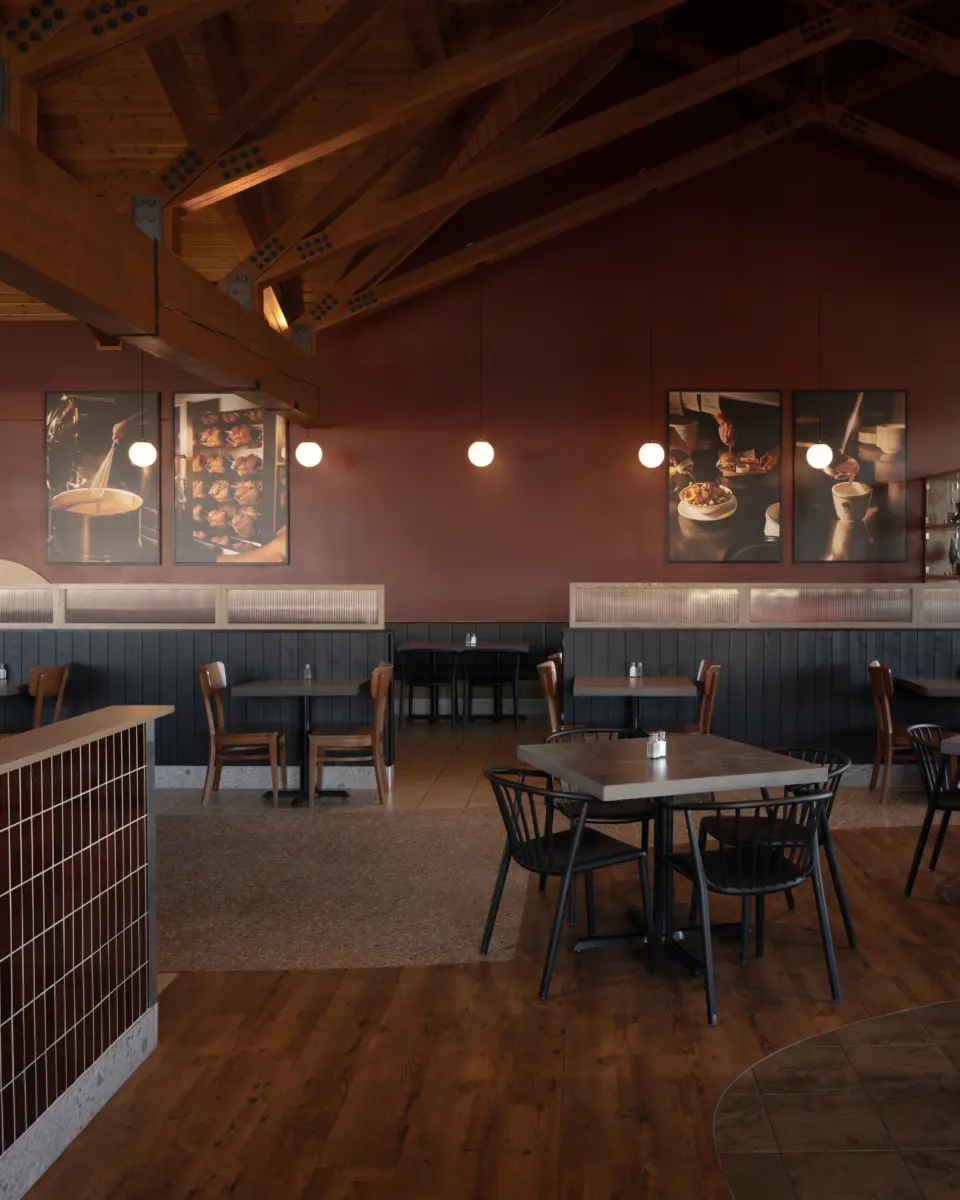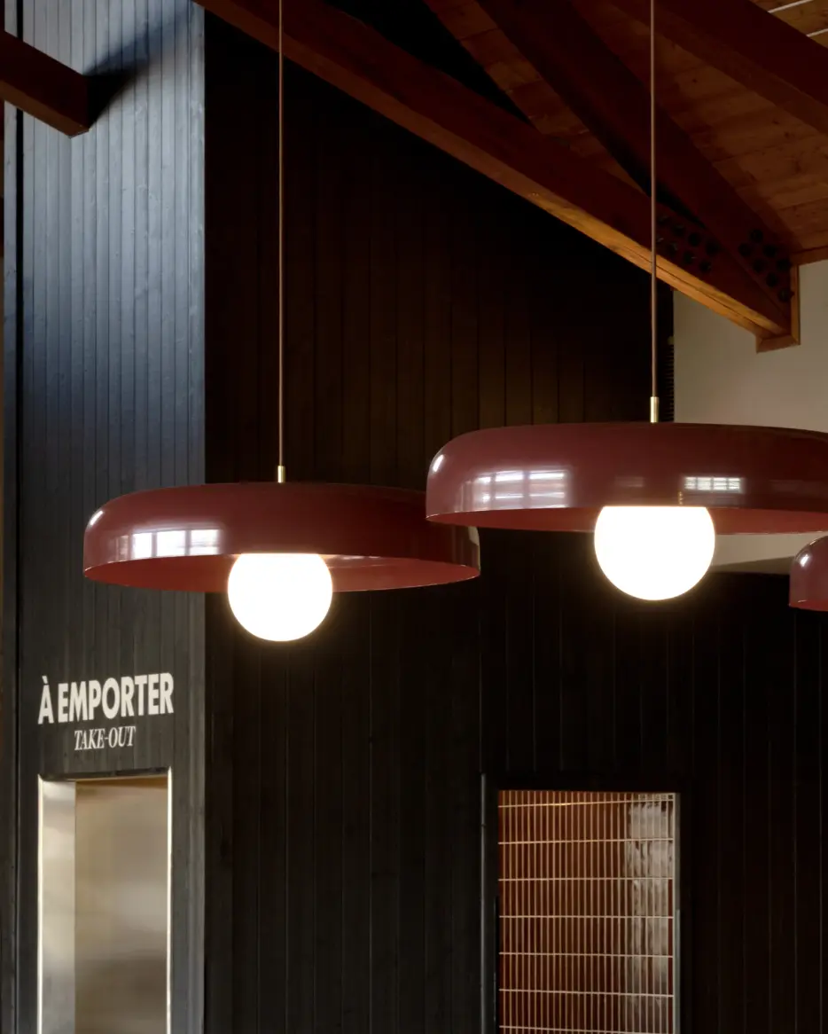 At the heart of this space, our Luminaire Authentik creations take center stage. Their presence brings an artisanal touch to the environment while enhancing the natural material palette of the décor. The organic shapes and bold tones of the fixtures accentuate each area of the restaurant, creating a cohesive and inviting atmosphere.